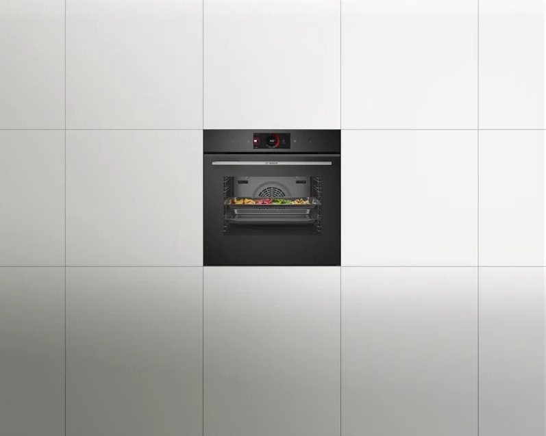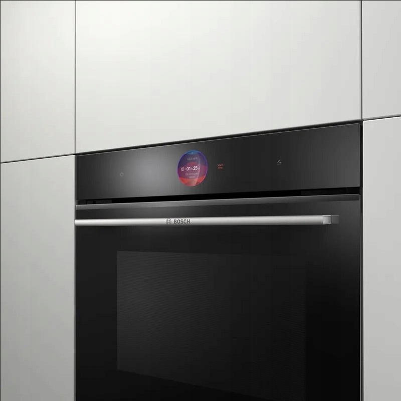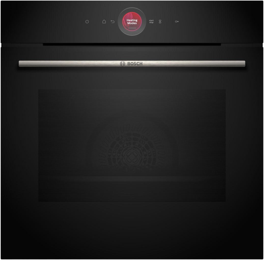 Серія 8, вбудована духовка, 60 x 60 см, чорний HBG7241B2. Вбудована духовка з цифровим кільцем керування та сенсорним дисплеєм TFT. Функція допоміжного харчування, Air Fry. Керуйте за допомогою програми Home Connect.
