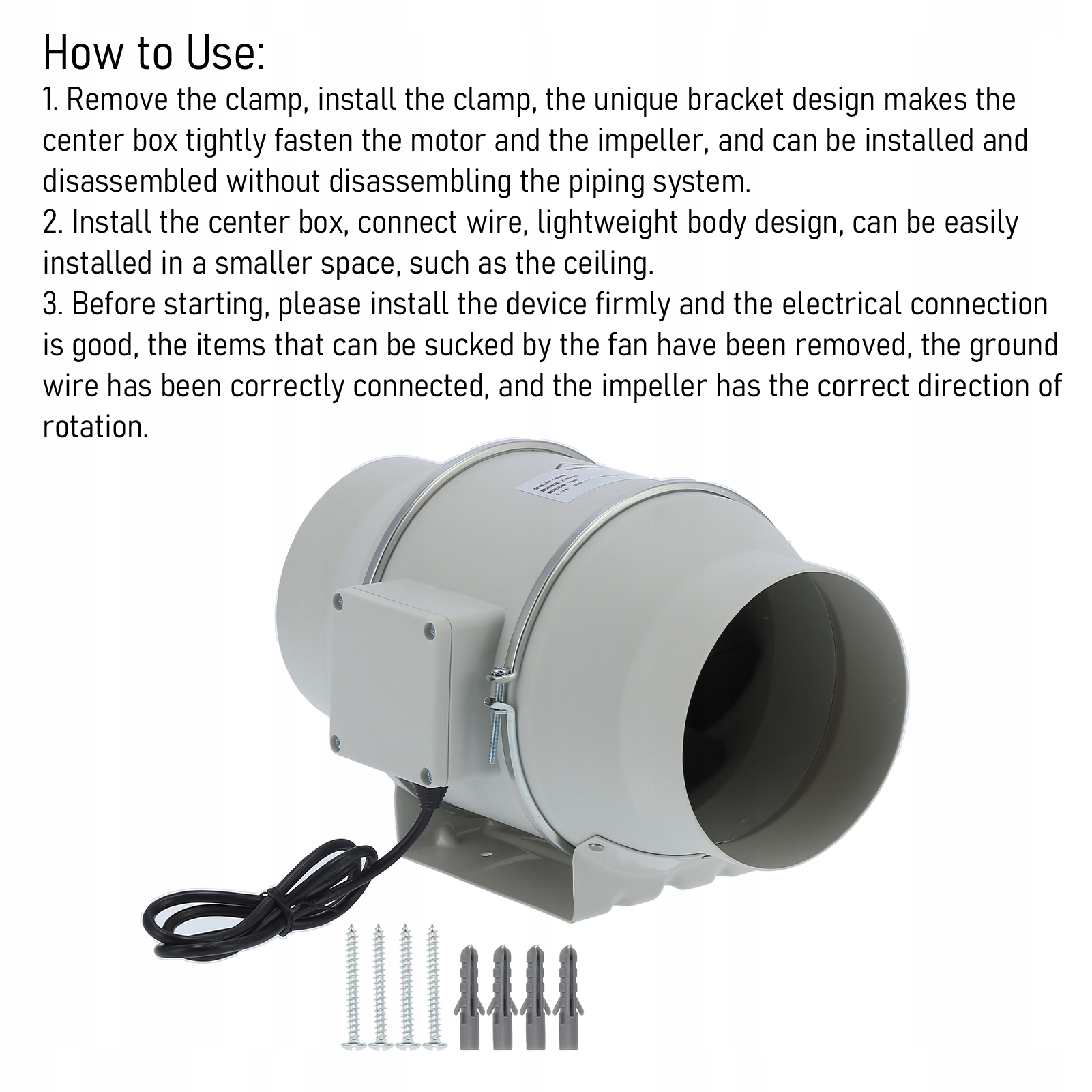 3. Перш ніж почати, надійно встановіть пристрій і переконайтеся, що електричне з’єднання є правильним, предмети, які могли всмоктуватися у вентилятор, видалено, провід заземлення під’єднано належним чином, а ротор має правильний напрямок обертання.