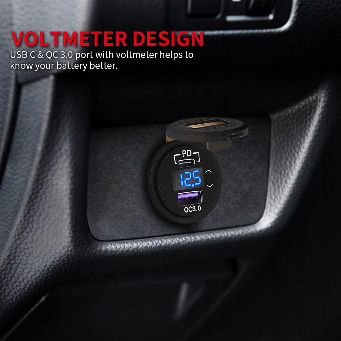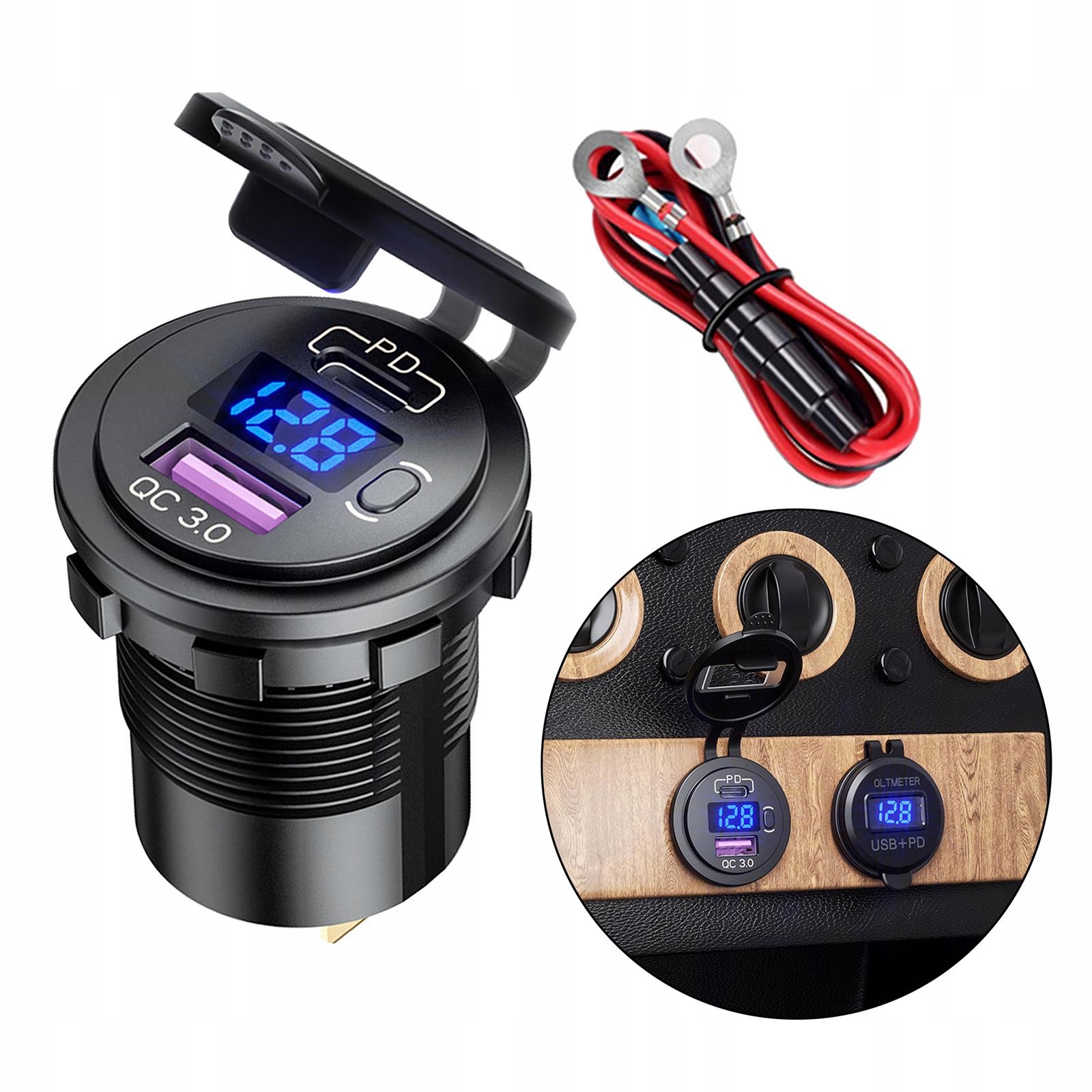 ▶ Автомобільний зарядний пристрій USB QC 3.0 + адаптер USB-C type-C PD, гніздо прикурювача, 48 Вт, світлодіодний вольтметр, швидкий для телефону, чорний