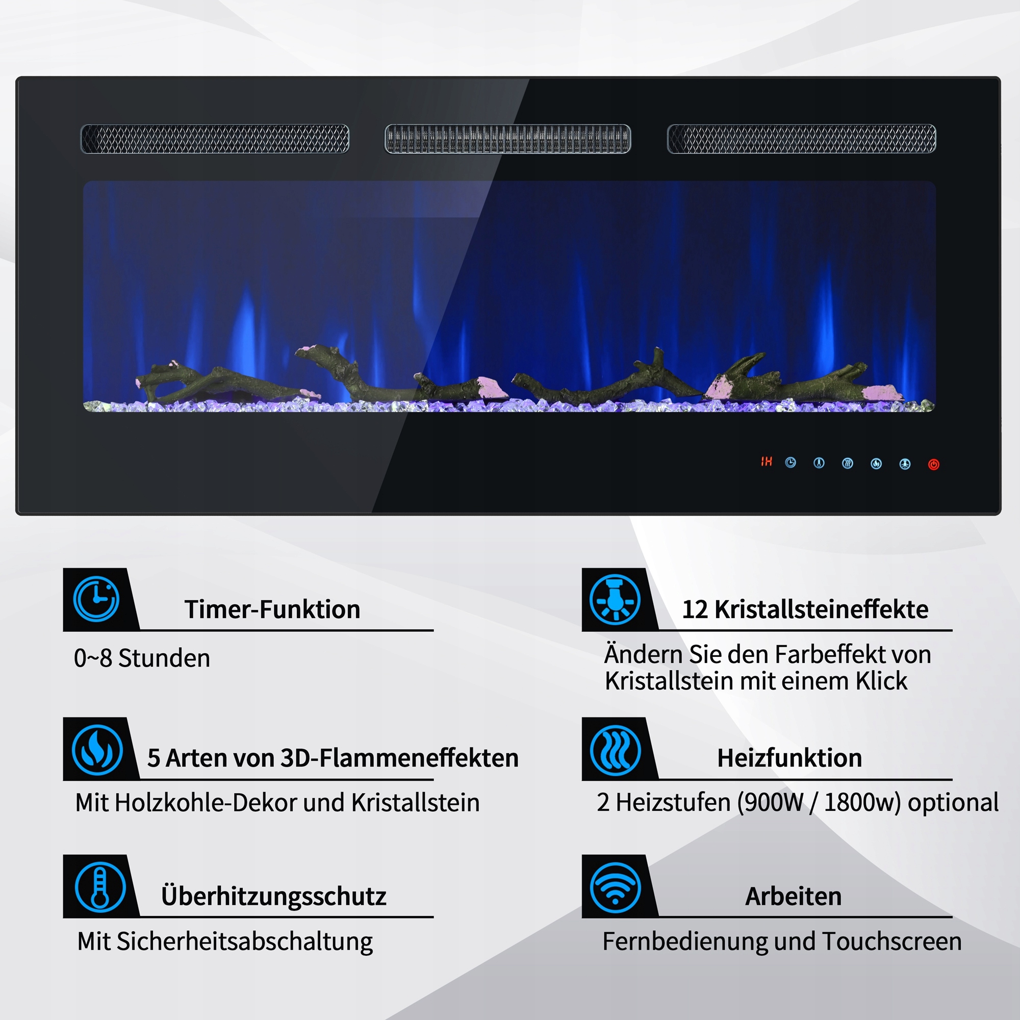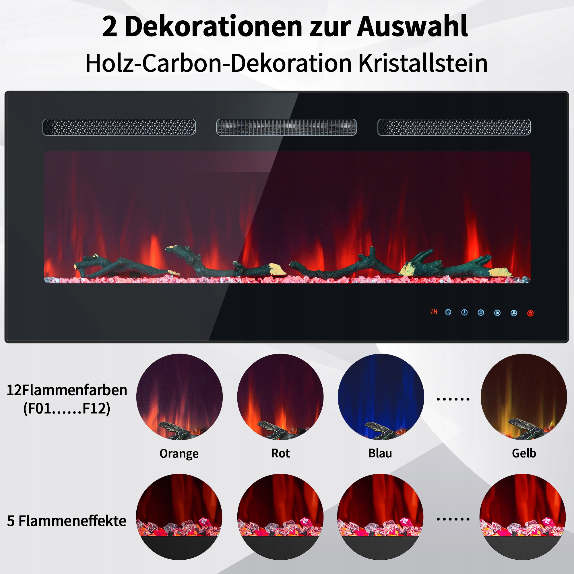 Електричний камін для вбудованого та настінного монтажу, 12 регульованих кольорів полум’я, регульований термостат, з набором кришталю та дерева, дистанційне керування та налаштування сенсорного екрана, 900/1800 Вт, 42 дюйми, 106,5 × 46,5 × 12 см