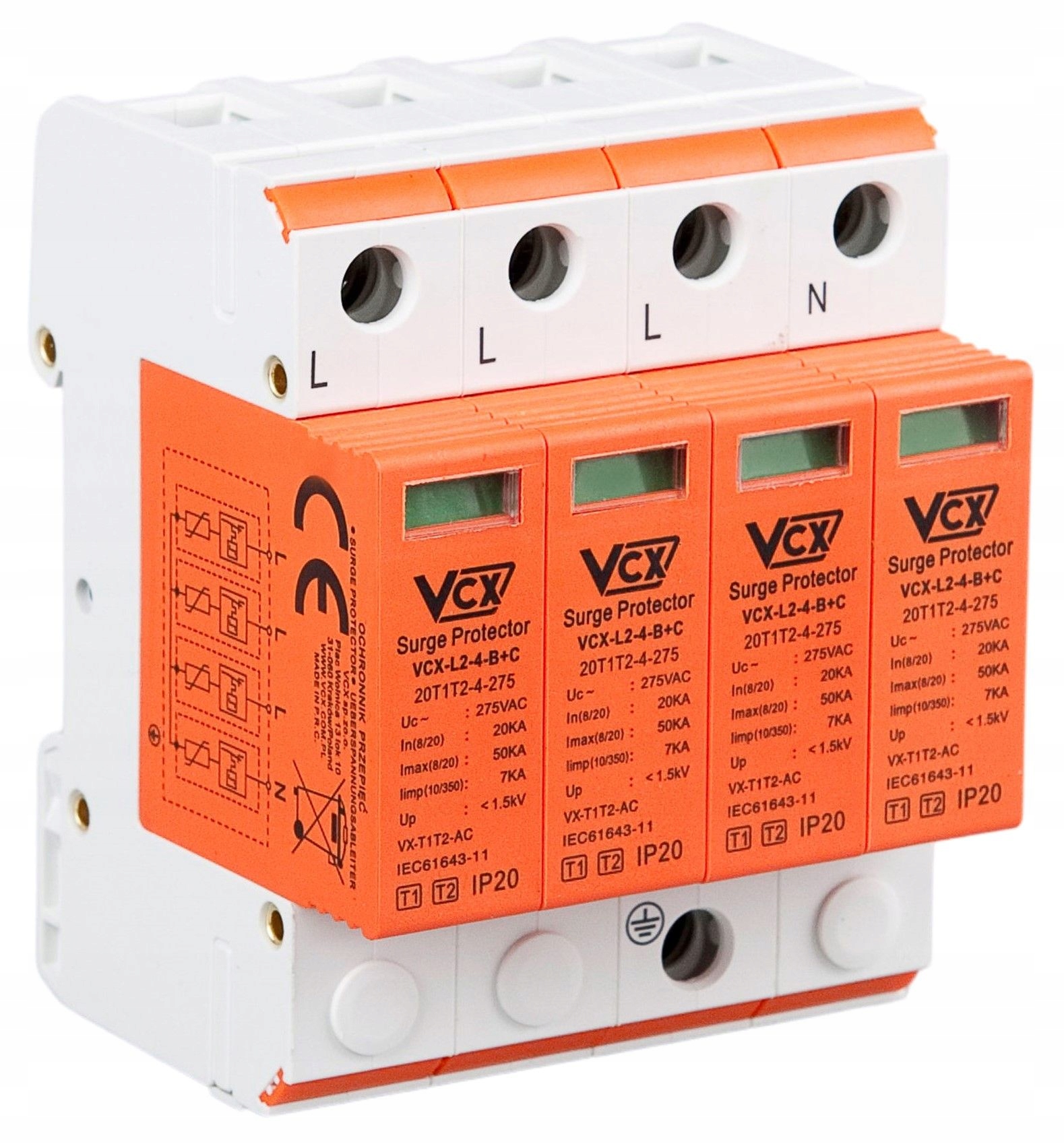 Модульні розрядники VCX-L1-B+C 6kA, клас T1T2. Вони призначені для захисту установок низьковольтного живлення від наведених і комутаційних перенапруг.
