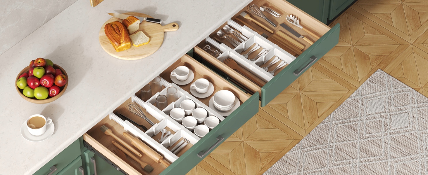 ✅ Легка установка без інструментів: Натисніть верхню кнопку, розтягніть до потрібної довжини і затягніть, щоб заблокувати організатор у ящику. Сильне пружинне напруження підтримує відсіки у відповідному положенні