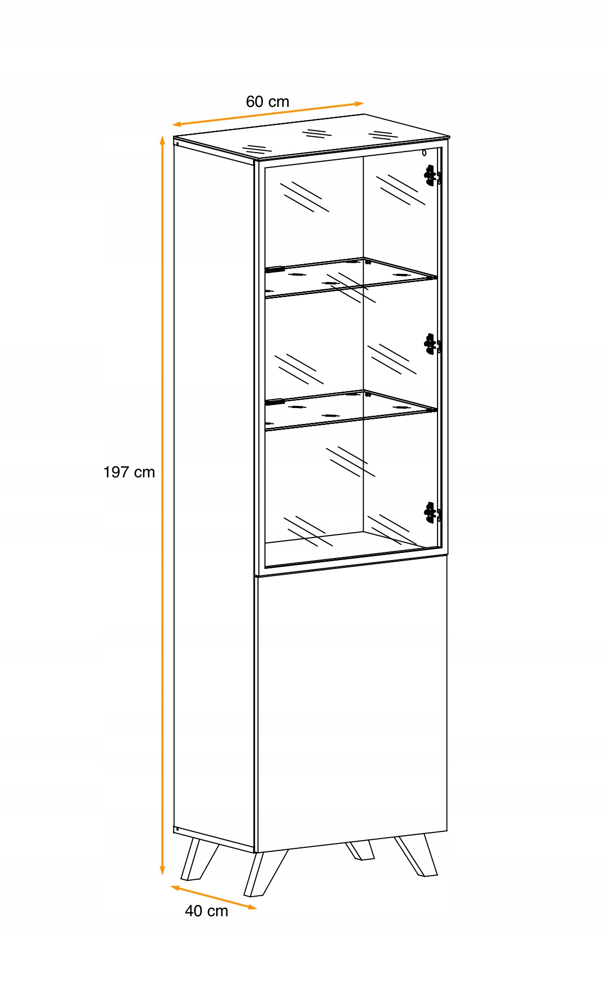 Високо стоячий сайт: двері, глазуровані в чорному алюмінієвому каркасі. За ними дві скляні полиці, освітлені світлодіодним освітленням. Нижче - звичайні двері, за ними одна звичайна полиця (2 простори). Чорні трапецієподібні ноги.