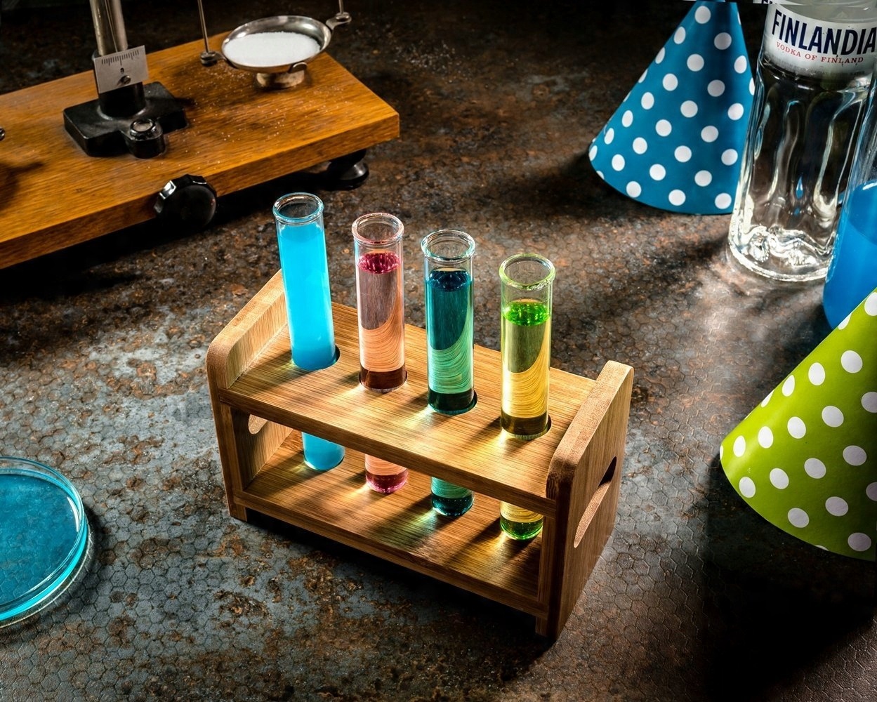 Як вечірка, це не може бути нудно, як окуляри, це не повинно бути нудно;), і це наші ... вечірні трубки або смішні, і в той же час практична альтернатива звичайним окулярам. На акуратній бамбуковій підставці є місце для чотирьох просто розмірів трубки, які ви можете доповнити напоями відповідно до смаку та розпізнавання, а потім елегантно їх відображати. Поки рука не буде розірвана, щоб досягти такої трубки, повної веселого та барвистого відсотка :)
