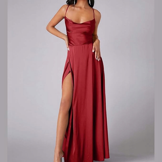 Це унікальне бордове вечірнє плаття - це поєднання елегантності та чуттєвого стилю. Зроблений із імітаційного атласу з тонким блиском, він прекрасно вписується на фігуру і додає шикарно з кожним рухом.