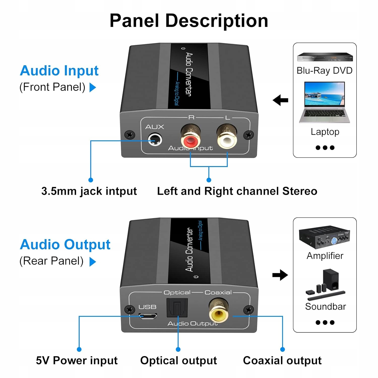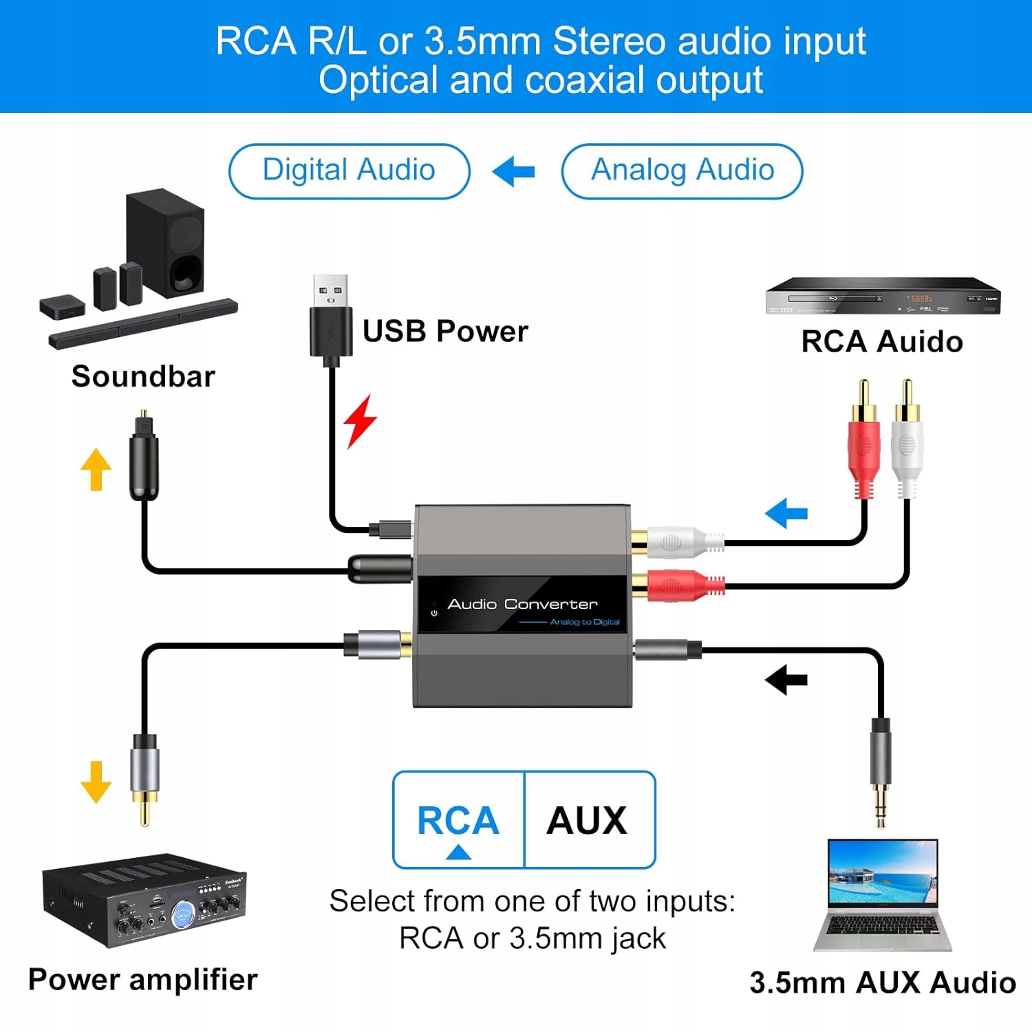 Аналогово-цифровий аудіоконвертер Перетворює аналоговий R/L RCA або AUX стерео аудіосигнал на цифровий коаксіальний аудіо та цифровий аудіо одночасно Toslink Spdif Optical. Примітка. Це не цифрово-аналоговий аудіоконвертер. (Його не можна використовувати для передачі цифрового звуку в аналоговий.)