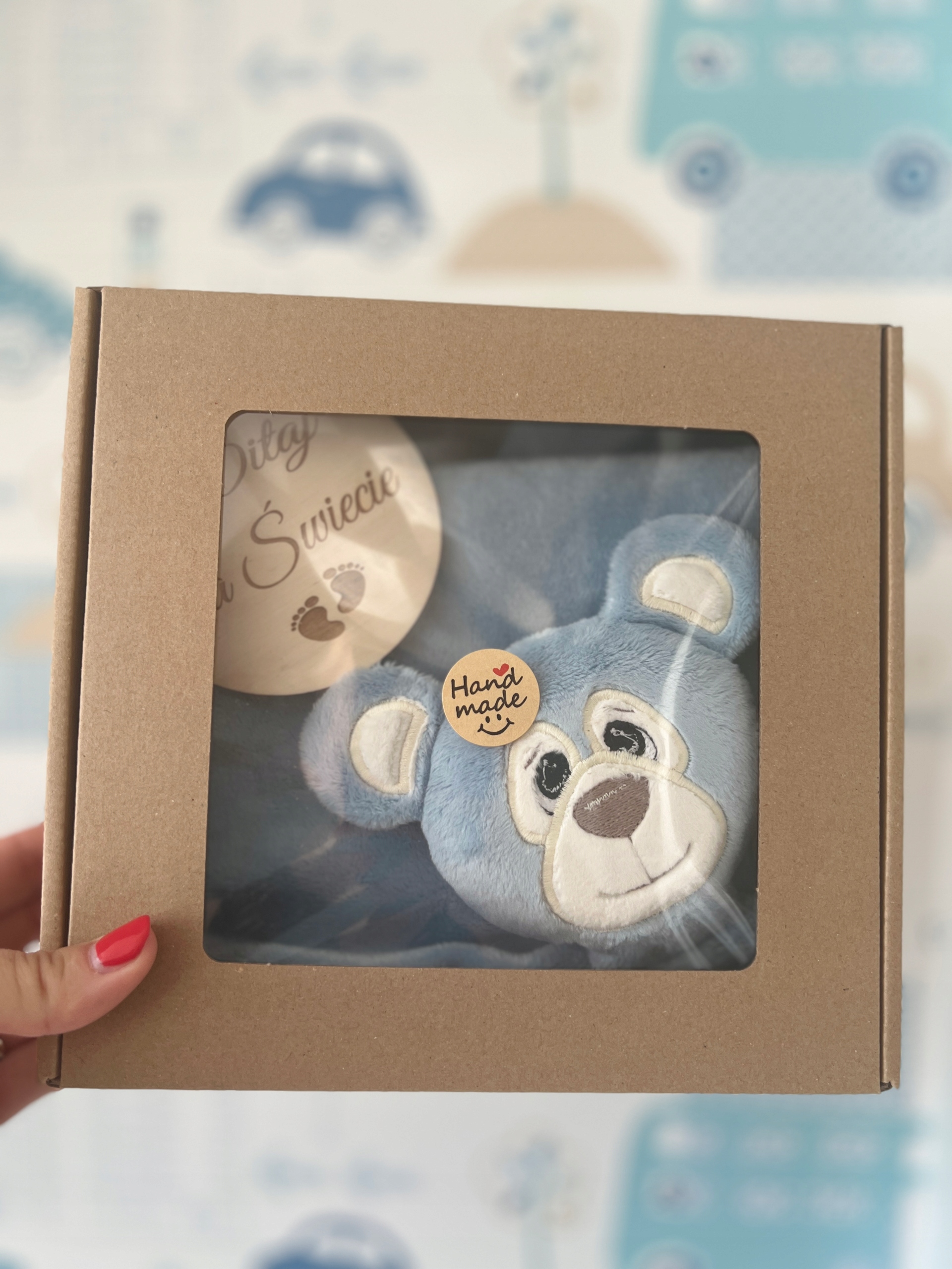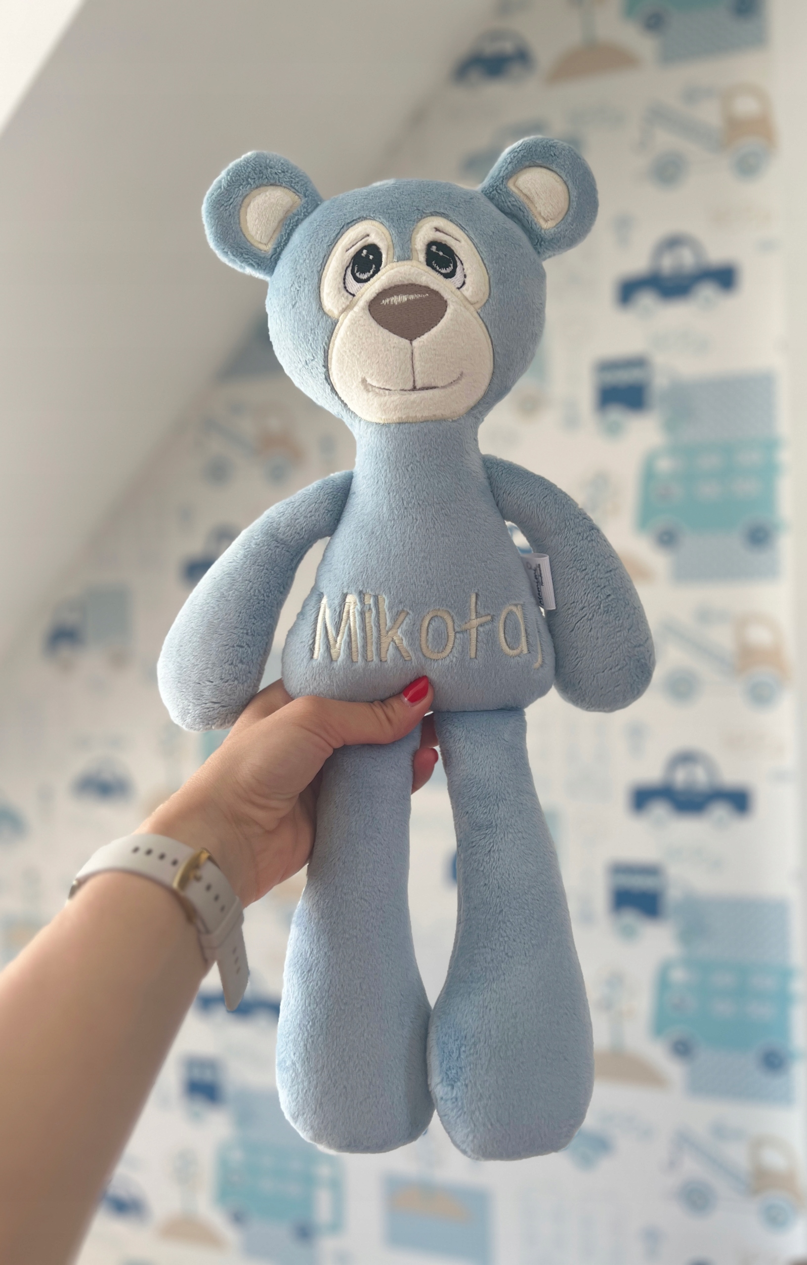 Ведмедик виготовлений з матеріалів найвищої якості (м'який фліс Мінкі - вага 380г - кольори дитячий блакитний і кремовий, антиалергічний наповнювач - силіконова кулька). Матеріали сертифіковані Oeko-Tex Standard. Плюшевий ведмедик має вишиту мордочку та очі, тому він безпечний для дитини.