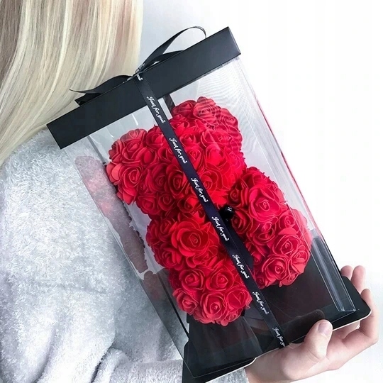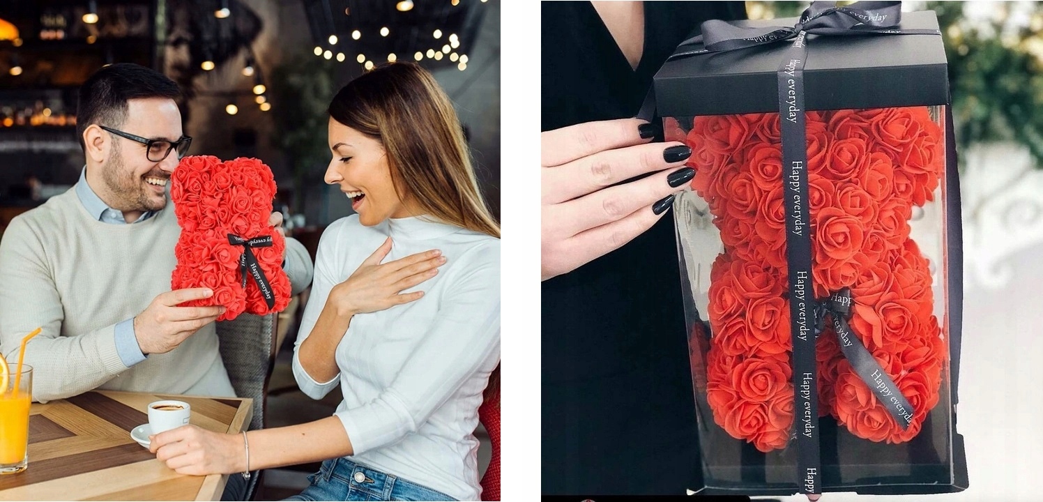 Упаковка плюшевого ведмедика розроблена спеціально для того, щоб, розв’язавши бантик, ви могли підняти прозору частину разом із кришкою. Ви можете накрити ведмедика, наприклад, пелюстками троянд, перш ніж закрити кришку. У результаті, якщо підняти прозору кришку з пелюсток квітів, виходить чарівний ведмедик із сотень троянд.