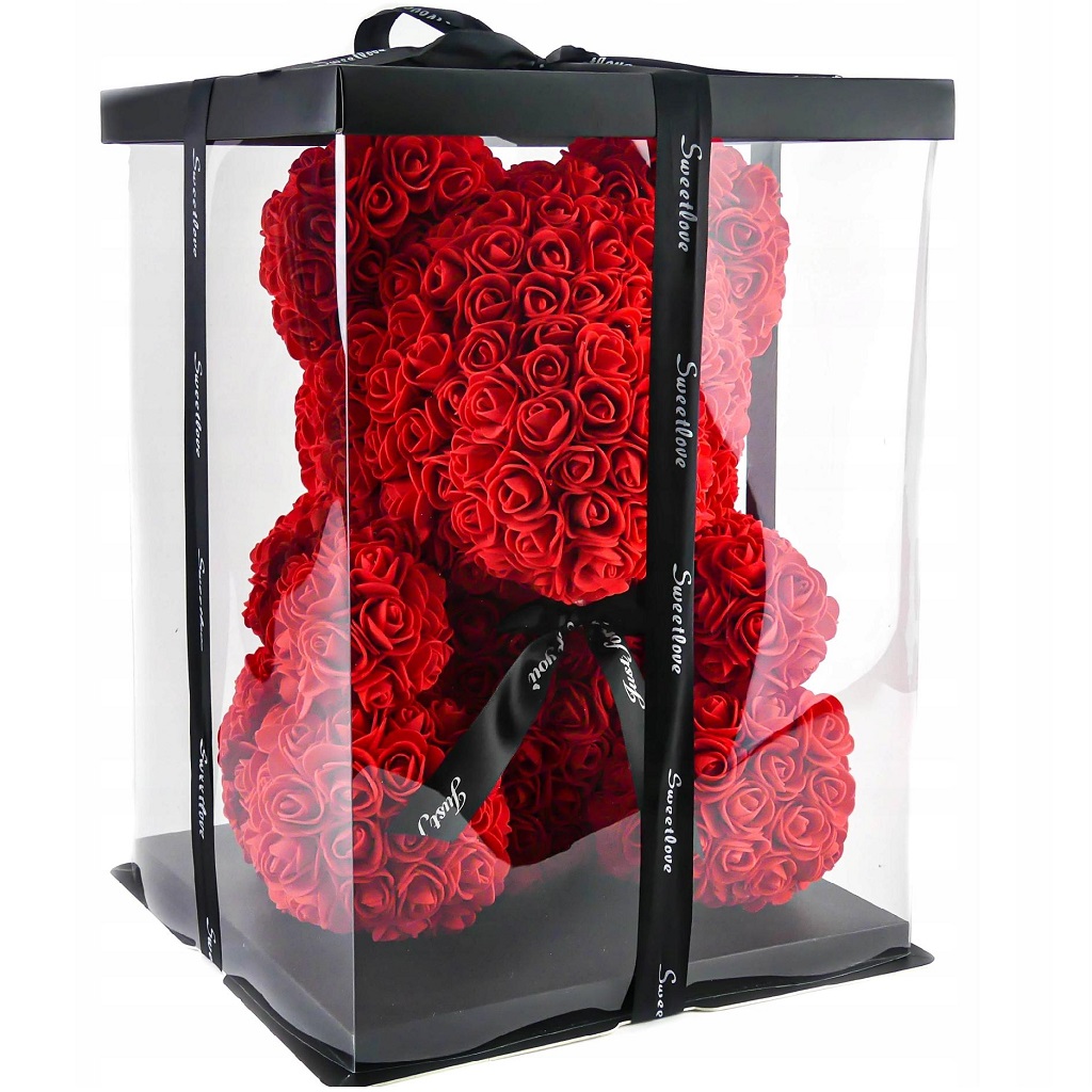 Упаковка плюшевого ведмедика розроблена спеціально для того, щоб, розв’язавши бантик, ви могли підняти прозору частину разом із кришкою. Ви можете накрити ведмедика, наприклад, пелюстками троянд, перш ніж закрити кришку. У результаті, якщо підняти прозору кришку з пелюсток квітів, виходить чарівний ведмедик із сотень троянд.