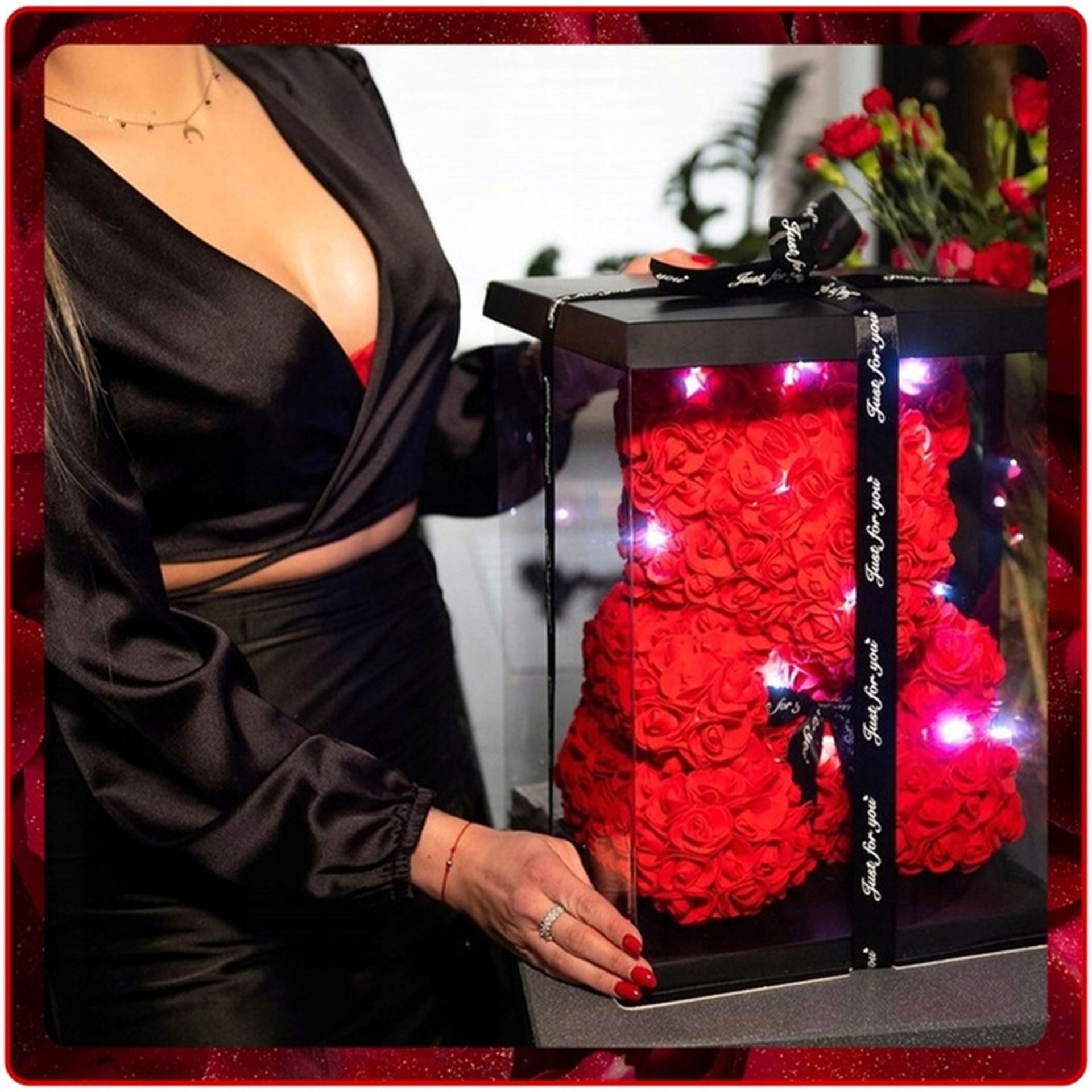 ВЕДМЕДИК З ТРОЯНДАМИ 30 СМ ТРОЯНДОВИЙ ВЕДМЕДИК З ПЕЛЮСТКАМИ ТРОЯНД ПОДАРУНКОВА КОРОБКА+20LED