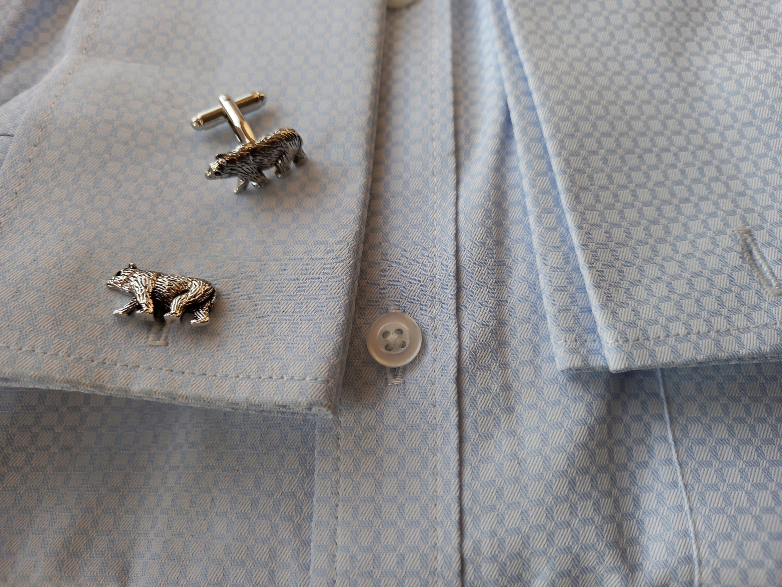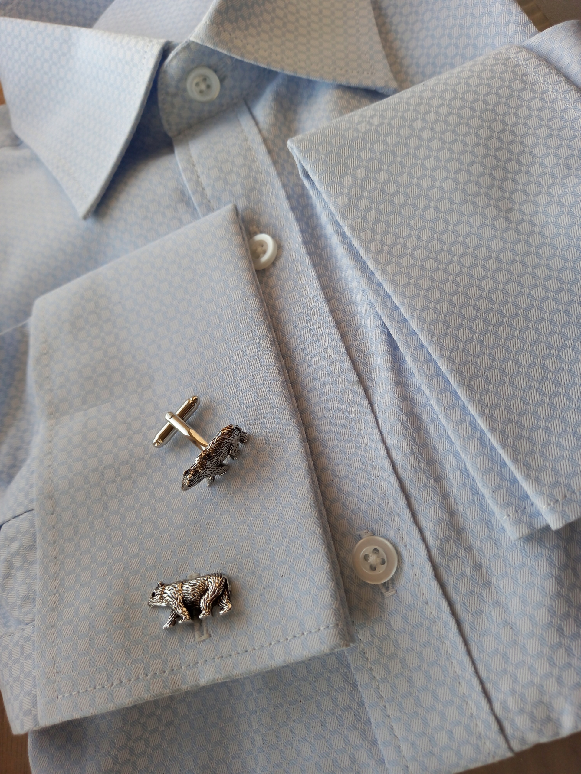 Запонки для сорочки у формі ведмедика Ведмедик. Запонки виготовлені з дорогоцінного металу. Пара запонок упакована в синю або чорну картонну коробку. За додаткову плату ми можемо упакувати запонки в ексклюзивний чохол Exciting із візерунком зміїної шкіри зовні та атласною тканиною та написом «Тільки для тебе» всередині.