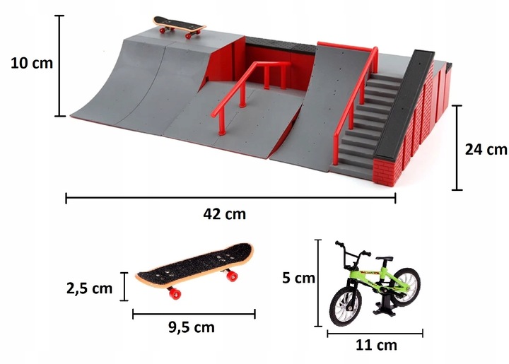 - Розміри оригінального розташування скейтпарку (як на малюнках і в упаковці): 42 x 24 x 10 см (довжина x ширина x x висота)