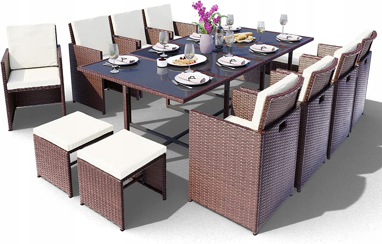 Цей ексклюзивний лаунж-набір «Вегас» від Swing & Harmonie® безперечно привертає увагу. Набір доступний у 3 кольорах і 6 розмірах, вміщуючи до 16 осіб. Поєднання вузьких ротангових смуг і матової рами надає меблям елегантний вигляд і неймовірну довговічність. Досвідчені ткачі вручну сплели високоякісне поліротангове волокно навколо рами з порошковим покриттям. Поліротан надзвичайно стійкий до погодних умов, простий у догляді та стійкий до високих температур, морозу, хлору та солоної води. На відміну від звичайного ротанга, поліротанг не розсипається на дрібні частини, стійкий до ультрафіолетового випромінювання і надзвичайно гнучкий. Міцна рама повністю пофарбована порошковою фарбою. Порошкове фарбування не тільки красиво виглядає, але й захищає метал від зовнішніх погодних умов. На відміну від звичайної пофарбованої рами, порошкове покриття є абсолютно стійким до подряпин та іржі. Великі тарілки з чорного скла забезпечать безпечне розміщення склянок і посуду. Пластини, виготовлені з безпечного скла, повністю тоновані - і тому непрозорі, що забезпечує гарні відблиски на поверхні столу. У комплект входять зручні подушки для сидіння і спинки товщиною 6 см. Чохли виготовлені зі 100% поліестеру та стійкі до води та бруду. Завдяки вшитим блискавкам чохли можна легко зняти та випрати при необхідності.Крім того, ви отримаєте високоякісний чохол від Swing & Harmonie®, який додатково захищає комплект від зовнішніх погодних умов.