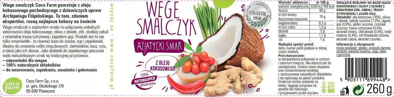 Вегетаріанське сало з азіатським смаком - це поєднання кокосової олії, оливкової олії та ароматної суміші трав, добірних ягід годжі, східного лемонграсу та солодкої цибулі.