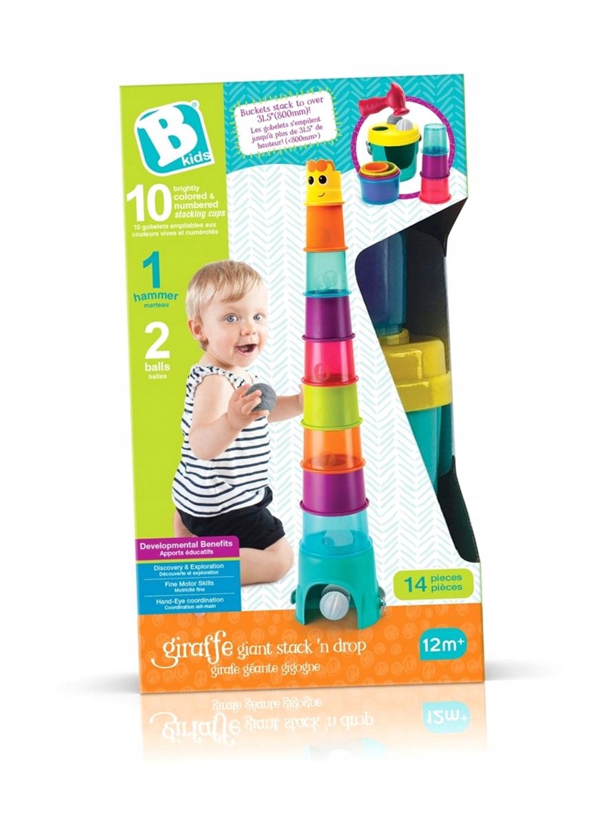 Поставте різнокольорові чашки в надзвичайно високого жирафа XL! Він дозволяє побудувати вежу висотою до 80 см зі спеціальною функцією перекочування кулі в тунелі. Гра розвиває моторику дітей. Всі 14 елементів складаються в зручний транспортний пакет.