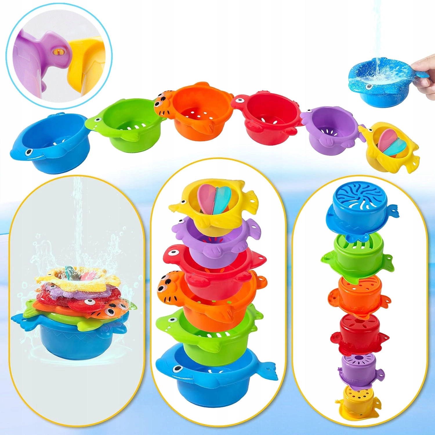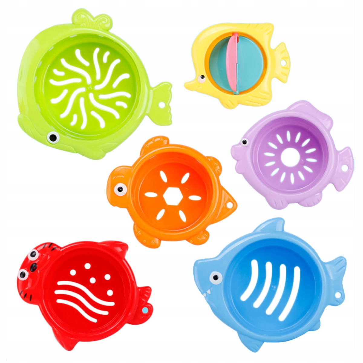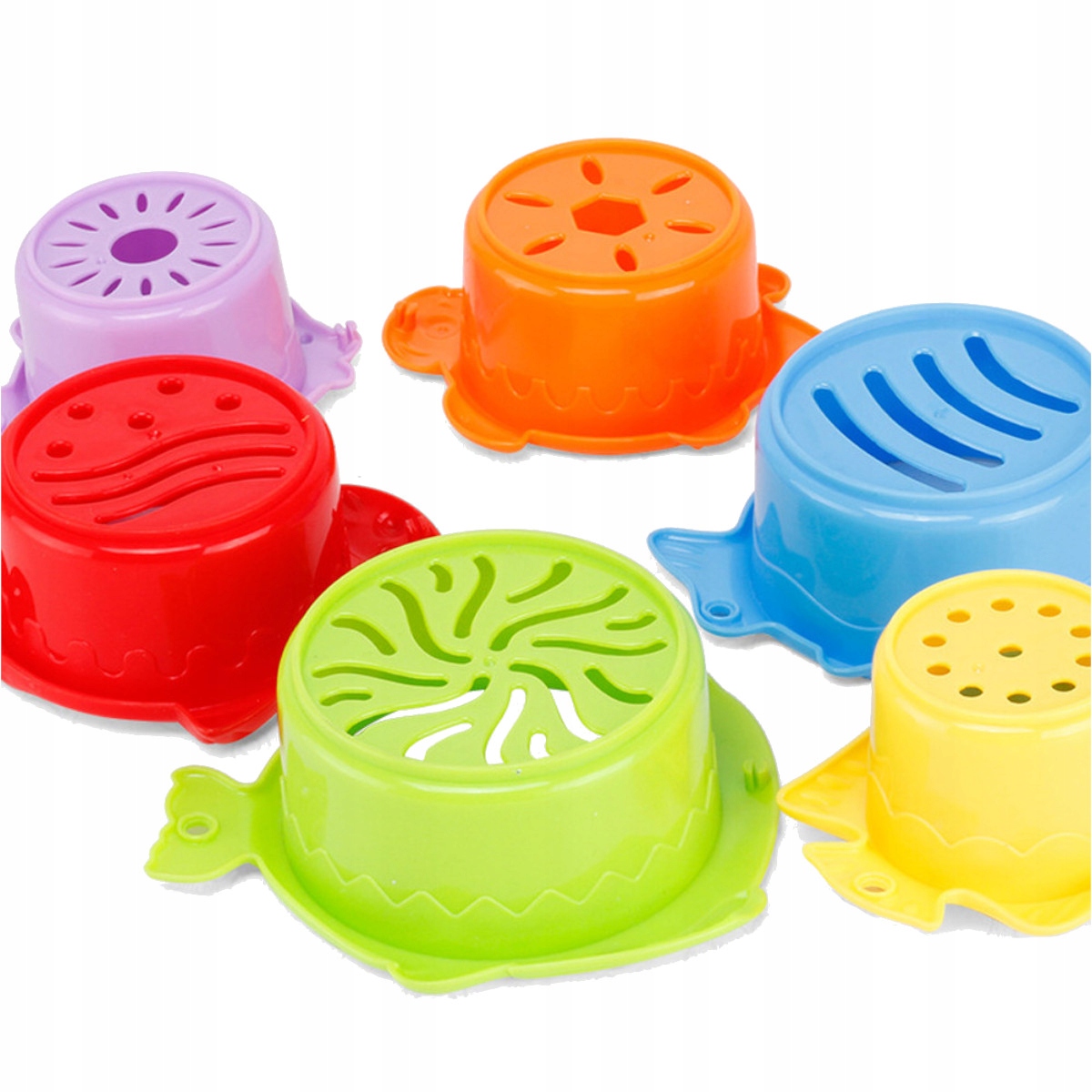 Діти люблять воду, люблять купатися і грати ще більше під час купання. набір з 6 барвистих чашок з отворами забезпечить велику забаву у воді. Завдяки різній формі отворів на дні чашок вода тече з різними темпами, а спостереження за потоками води , що утворюють міні -водоспади, спричинить велику радість для вашої дитини. Шліфувальна машина, розміщена в найменшій чашці, робить задоволення більш привабливим.