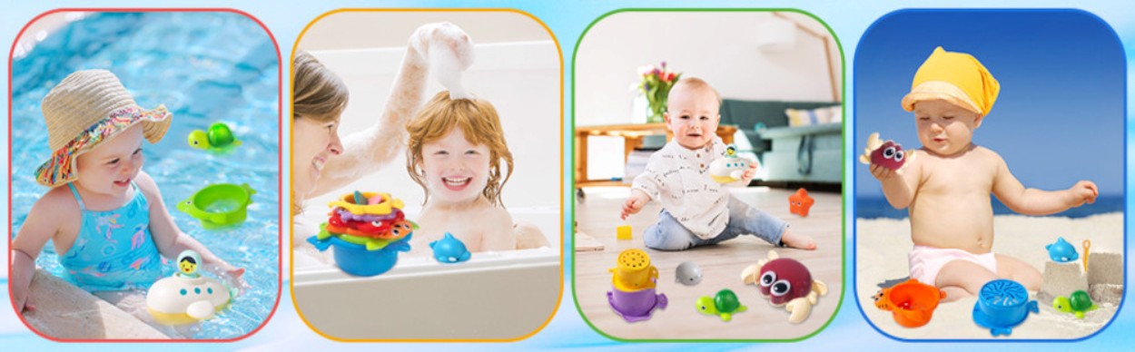 Барвисті чашки для ванни та іграшка з пісочниці