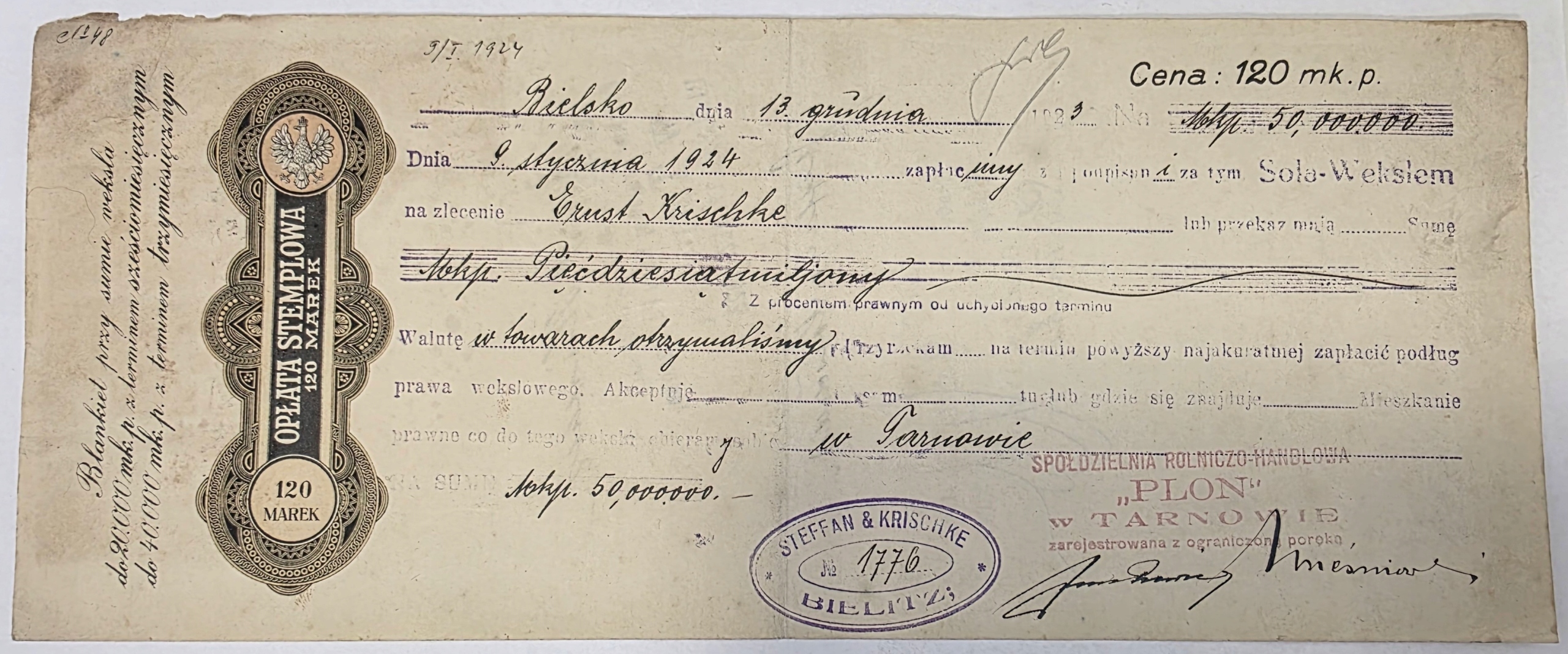 Оригінал, заповнений фінансовий документ у формі переказного векселя, виданий у Бєльську 1992 року. 13 грудня 1923 р., з датою оплати в Тарнові, 9 січня 1924 р.