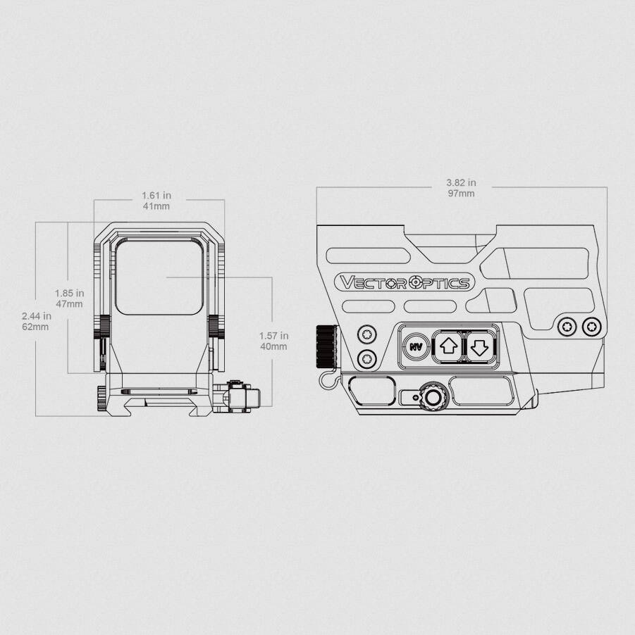 Технічні дані Матеріал Алюміній Розміри 97x41x62 мм Розміри прицілу: 31 х 26 мм Розмір точки прицілювання: 3 точки MOA Picatinny QD збірка Ударостійкість 1000G Час роботи на живленні до 50 000 годин Дальність регулювання прицілу по вертикалі: 190 MOA