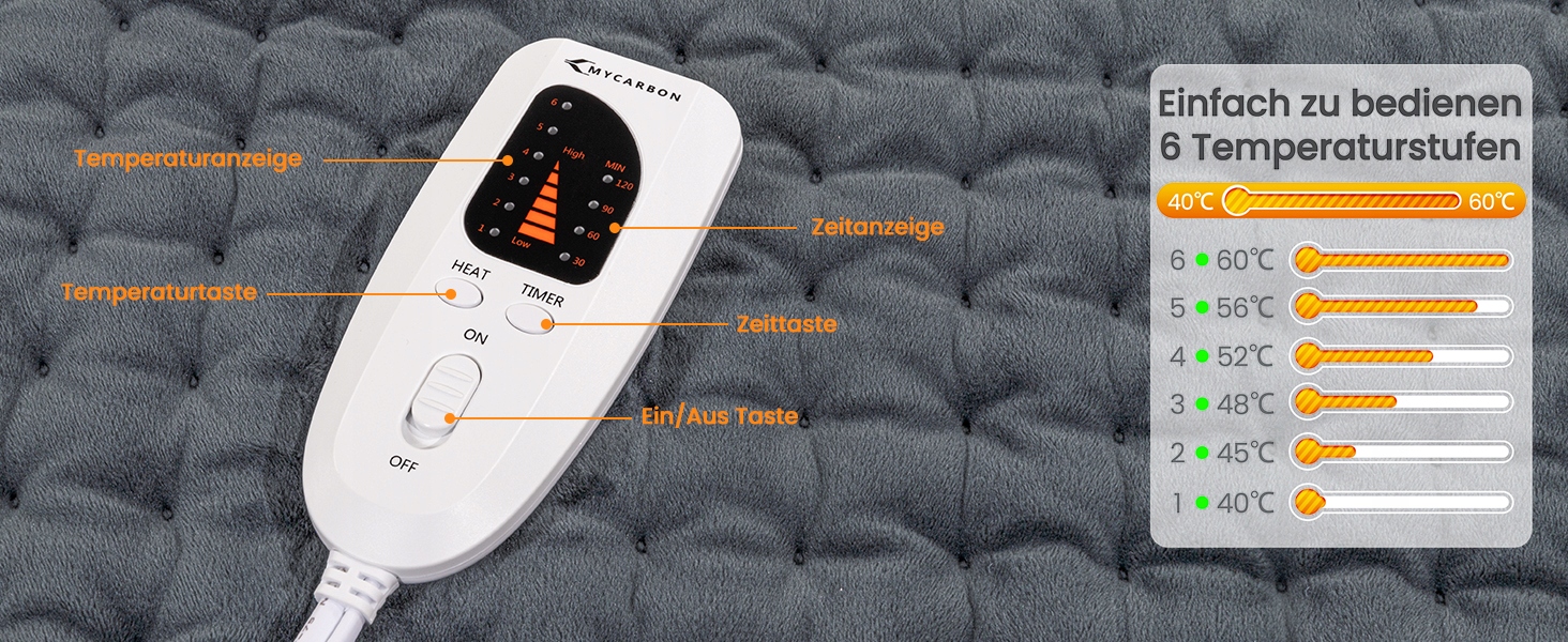 - Многозахищений нагрівальний комфорт: грілка оснащена безпечним і високоякісним нагрівальним дротом PTC, який забезпечує захист від перегріву. Через 2 години грілка автоматично вимикається. ПВХ-ізоляційна оболонка безпечніша за традиційні нагрівальні кабелі та гарантує, що ви не обпечетеся. Захист друкованих плат і нагрівальних кабелів надійно запобігає локальним опікам, спричиненим надмірними температурами, забезпечуючи максимальну безпеку.