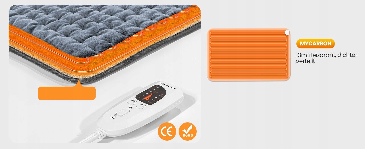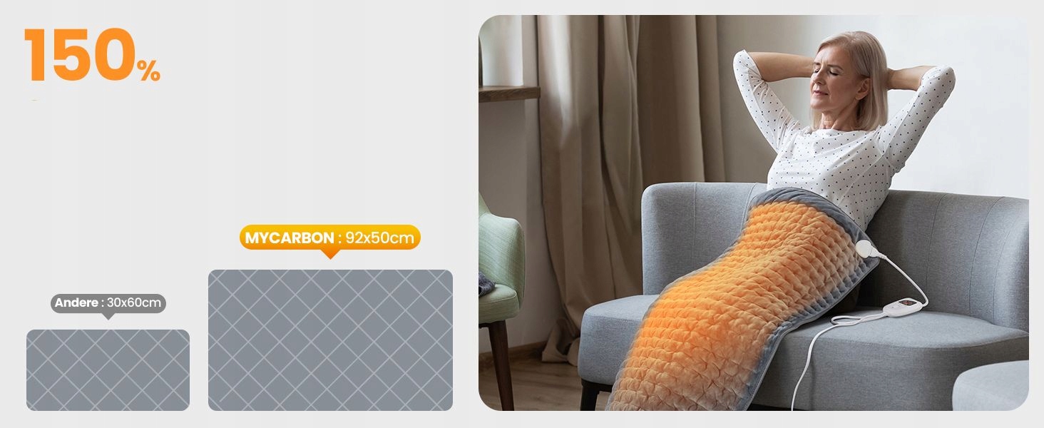 - Великий нагрівач, знеболювальне: У порівнянні з іншими меншими нагрівачами, електрична ковдра MYCARBON 50 x 92 см ідеально підходить для обігріву різних частин тіла (таких як живіт, ноги, руки, шия тощо). Надійно зберігає ваше тіло в теплі взимку та знімає симптоми втоми та біль у попереку, плечах і шиї.
