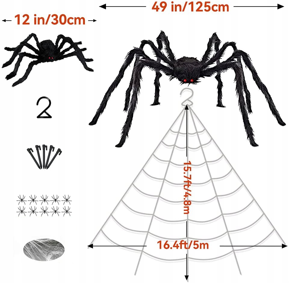 🕷️ Великий набір прикрас на Хеллоуїн: наш набір прикрас для павутини на Хелловін включає 1 x 5 м трикутну гігантську павутину, 1 x 1,25 м страшного великого павука, 1 x 30 см страшного павука, 10 x міні-павуків, 50 г розтяжної павутини для прикраси саду на Хелловін. Поставляється з 1 гаком для ринви та 5 кілочками для забивання