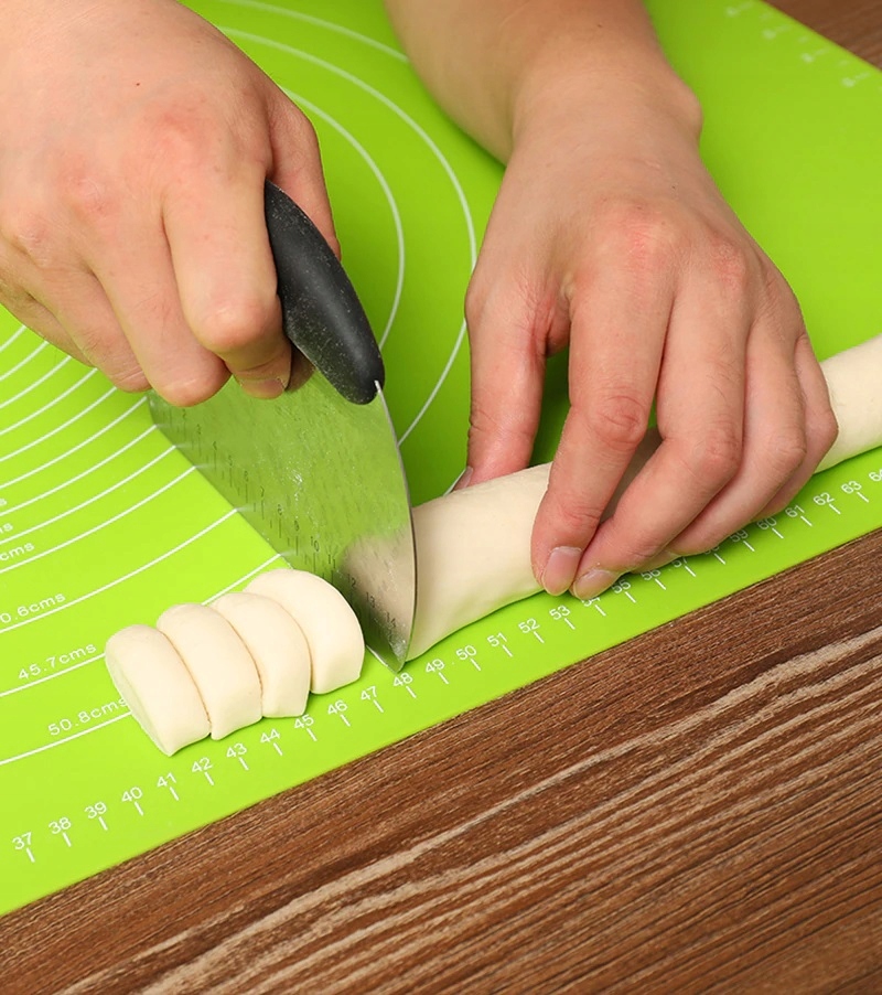 На краях килимка є сантиметрова шкала. Додаткова сантиметрова шкала, починаючи з центру, допоможе замісити, наприклад, шматок тіста для піци відповідного діаметру.