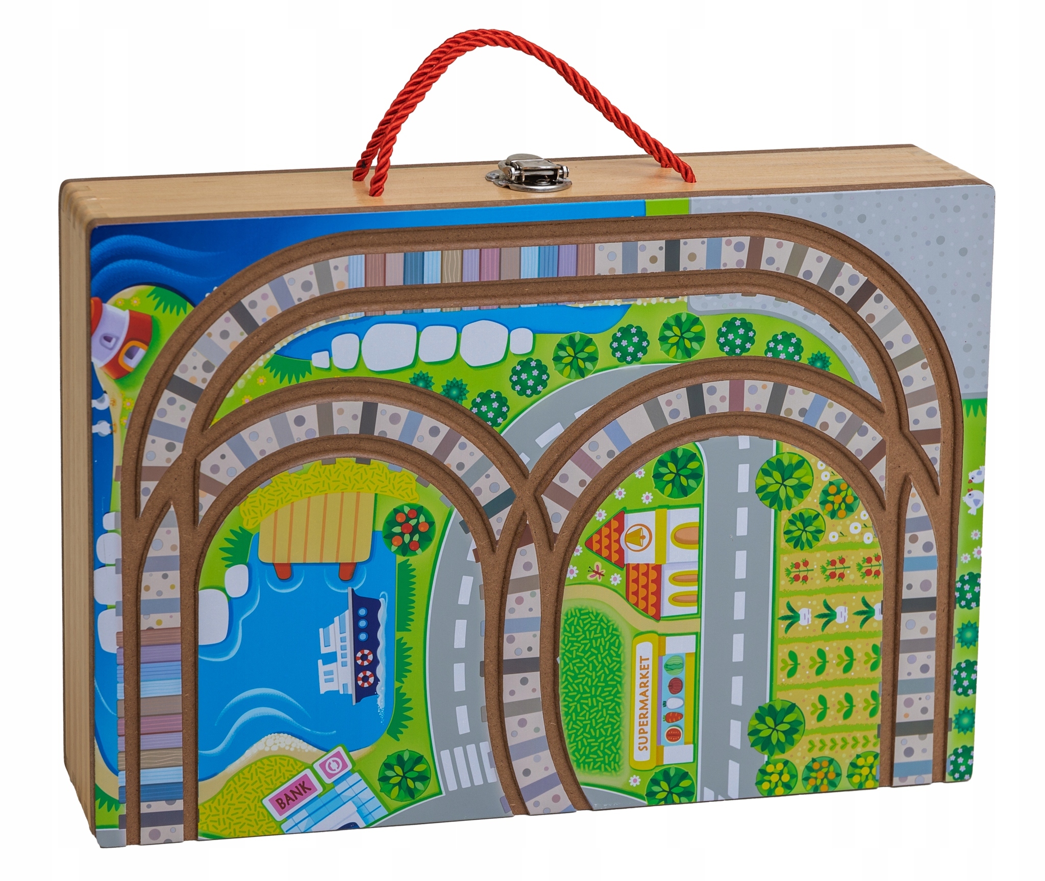 - дерев'яна валіза 2 в 1, всередині валізи цілий набір блоків, транспортних засобів і елементів міста. Зовнішня сторона – дошка з дорогою та коліями.
