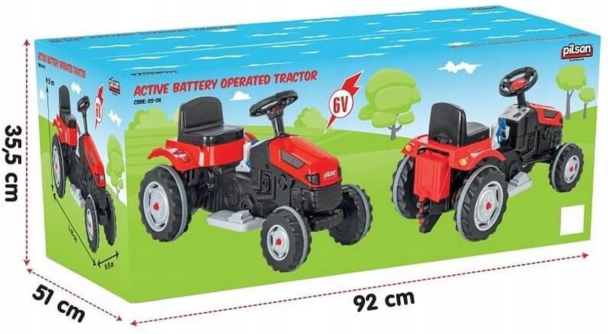 Зручне сидіння має можливість регулювати відстань до керма, що дозволяє правильно підлаштувати його під зріст дитини. Як транспортний засіб для маленьких дітей, трактор дуже стійкий на дорозі. Виготовлений з високоякісних матеріалів, стійких до стирання та ударів. Кольори та зовнішній вигляд відображають справжні трактори з найточнішими деталями. Буксирувальний гак у задній частині автомобіля дозволяє прикріпити причіп і зробити розваги ще привабливішими.