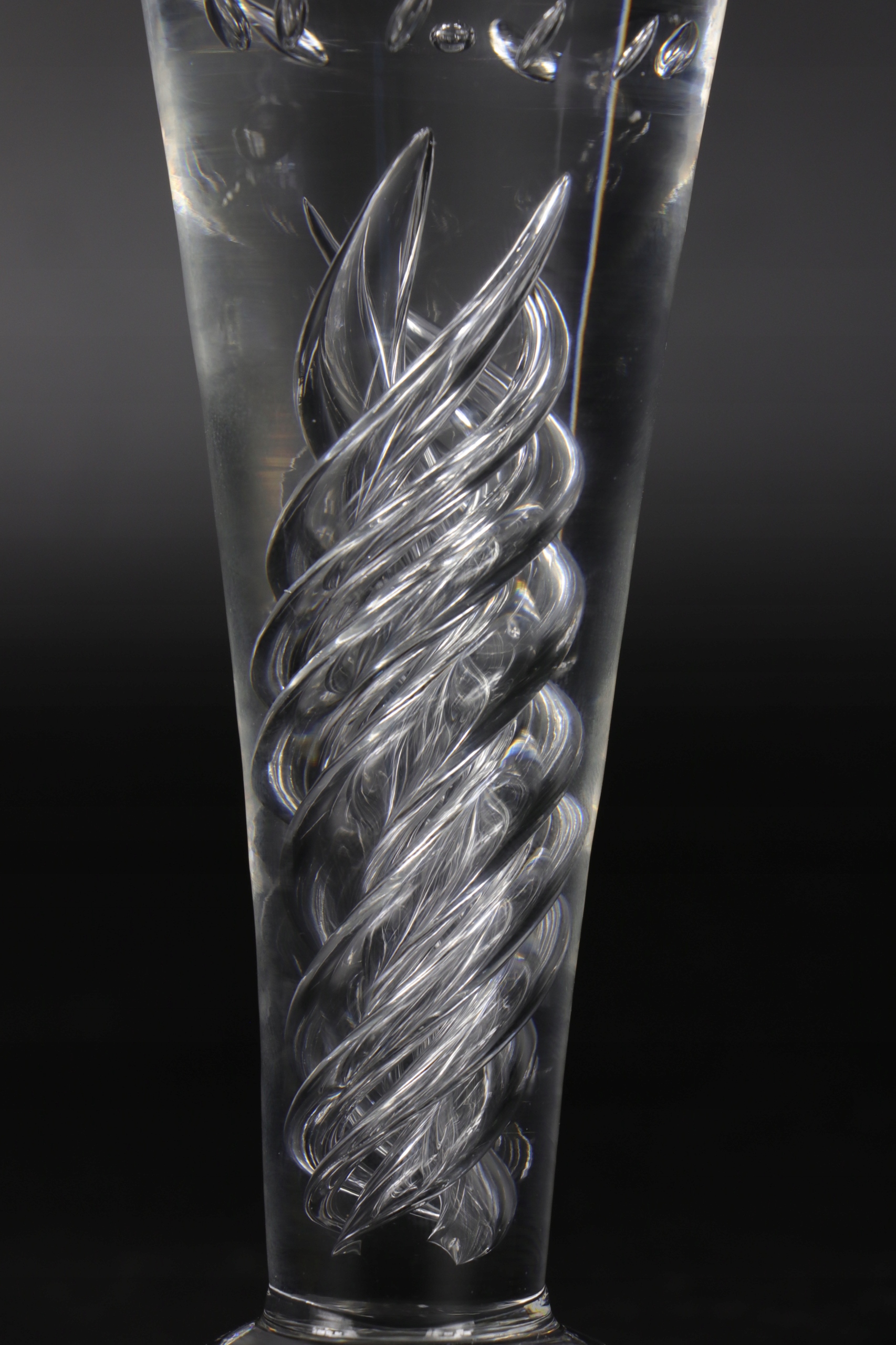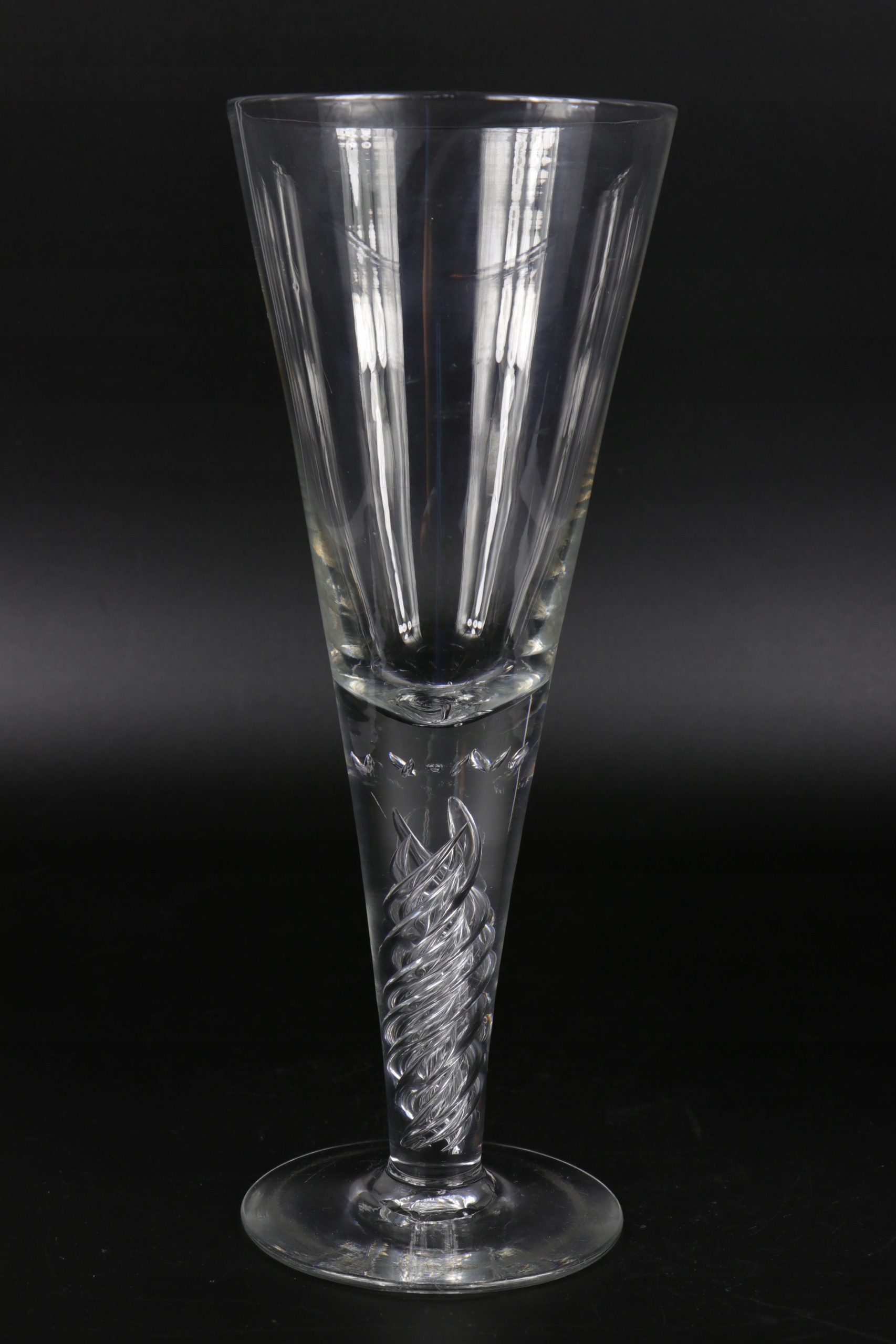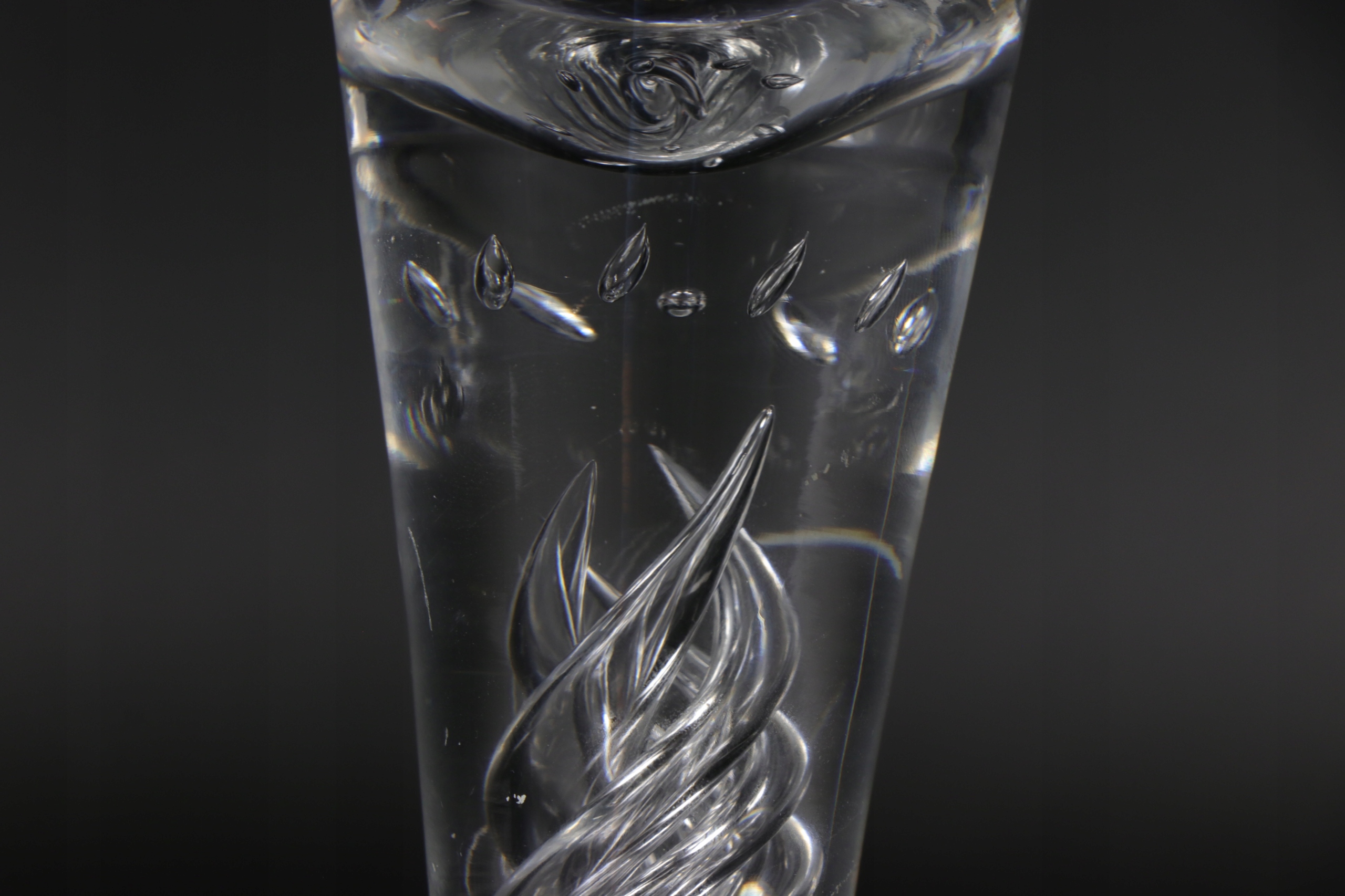 Цікавий, дуже великий кубок. Ніжка чаші прикрашена внутрішнім філігранним врізним візерунком. Чотири поздовжні стрічки, наповнені повітрям, складно закручені по всій довжині ніжки келиха. Видуте бите скло. Знизу видно невідшліфований фрагмент. Подібна чаша описана як дизайн Артура Герлаха з Гути Юзефіни