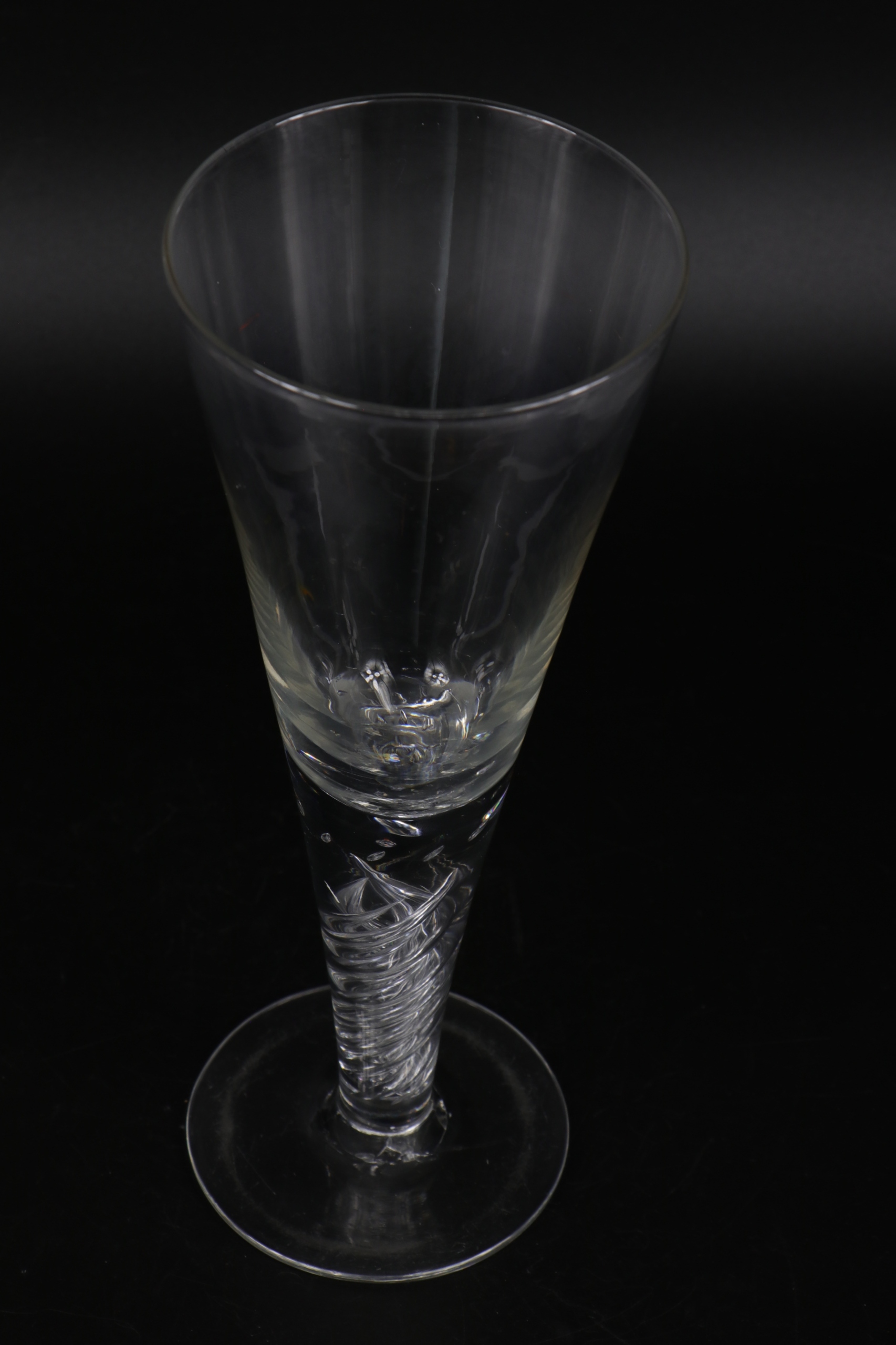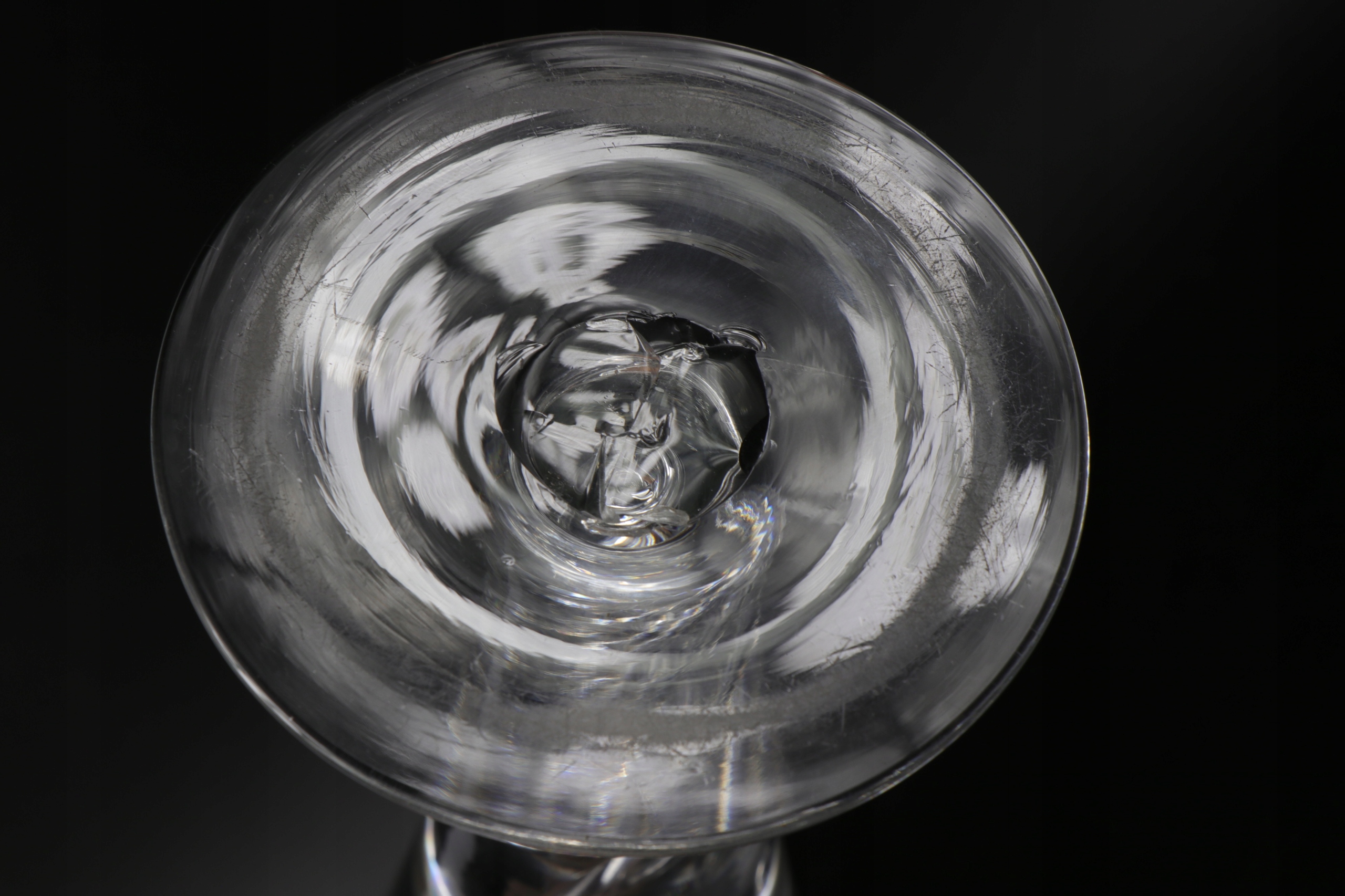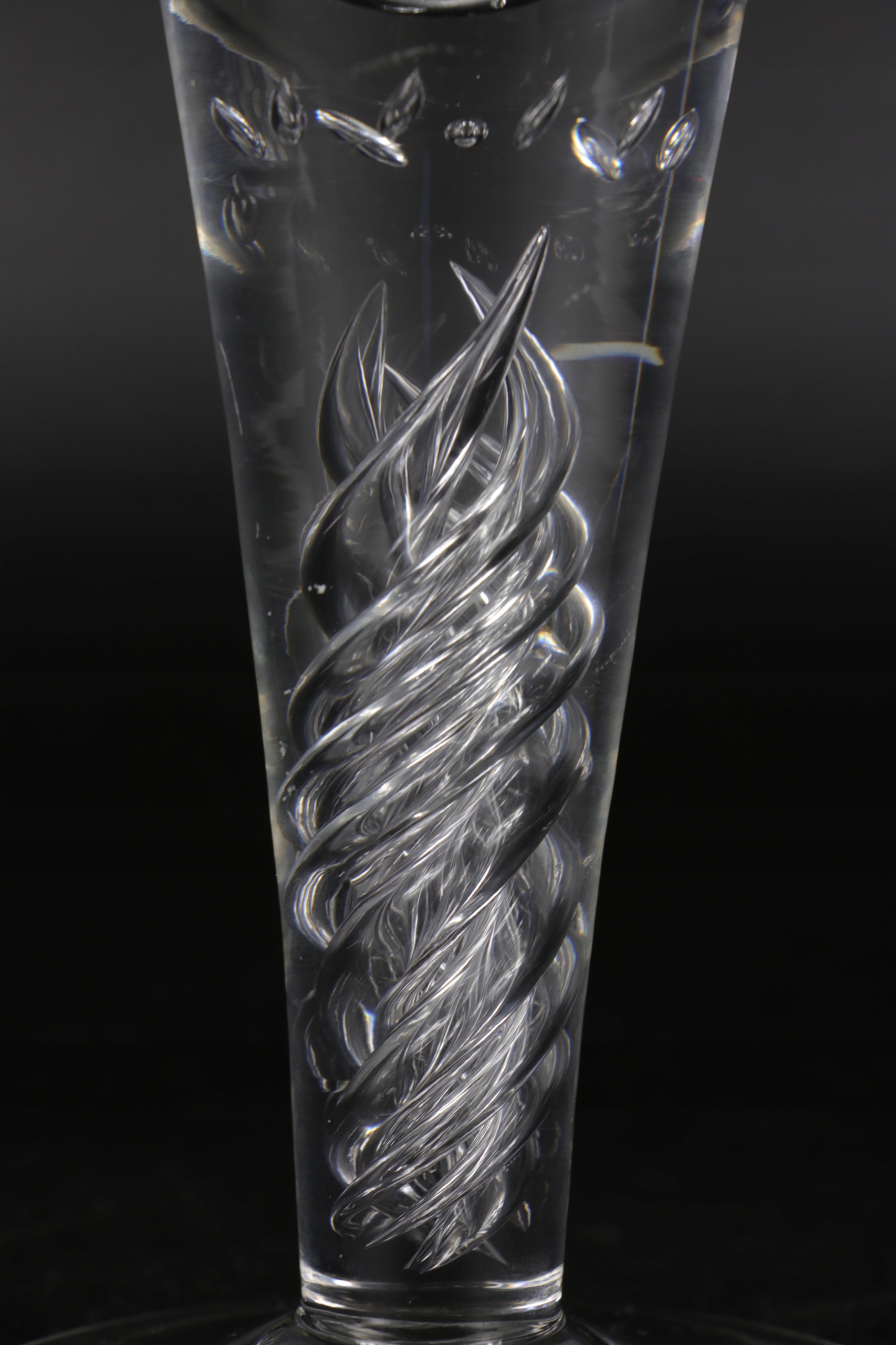 Цікавий, дуже великий кубок. Ніжка чаші прикрашена внутрішнім філігранним врізним візерунком. Чотири поздовжні стрічки, наповнені повітрям, складно закручені по всій довжині ніжки келиха. Видуте бите скло. Знизу видно невідшліфований фрагмент. Подібна чаша описана як дизайн Артура Герлаха з Гути Юзефіни