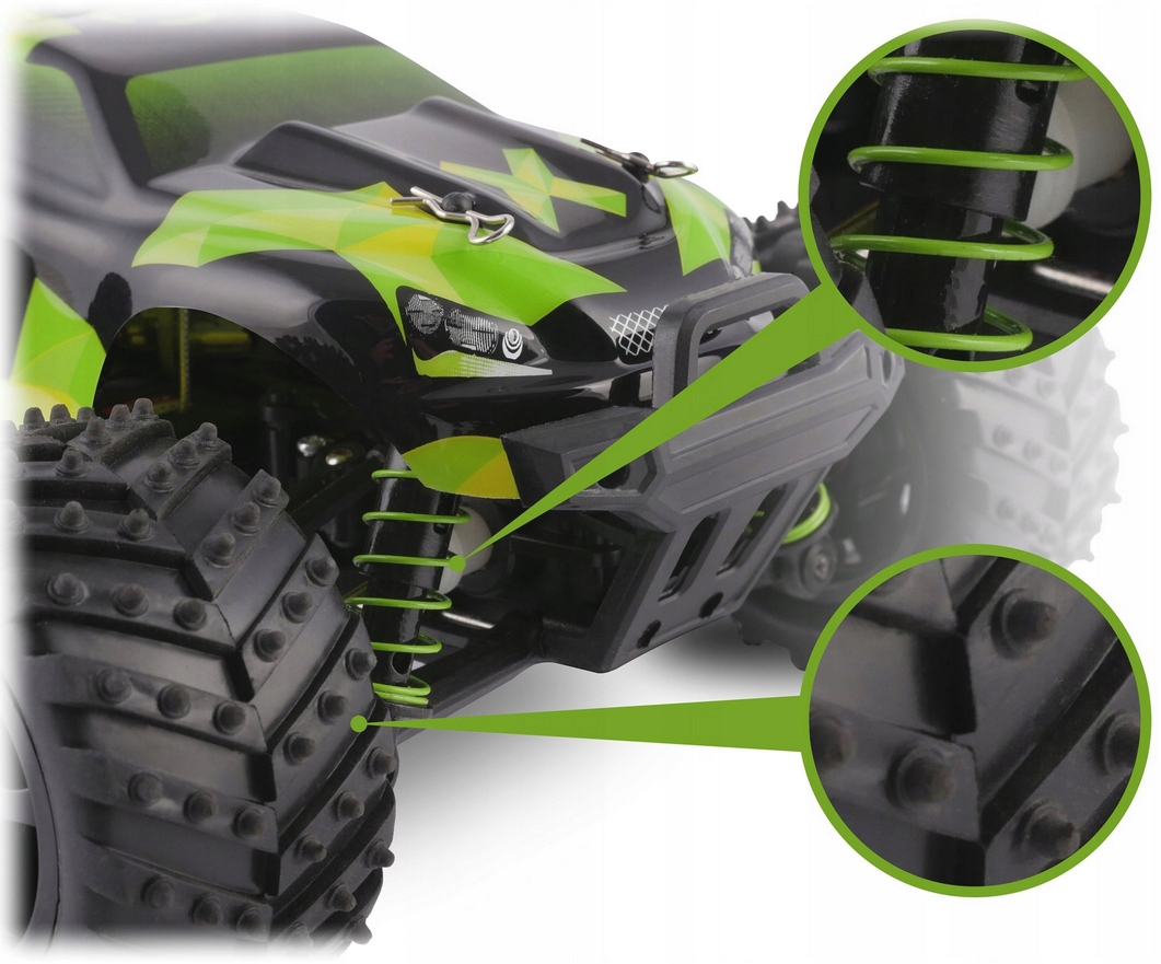 Як і в справжньому автомобілі, висока потужність приводу 4x4 повинна супроводжуватися хорошими шинами. Гнучкість шин забезпечує додаткову амортизацію, а спеціальний протектор належним чином зчеплюється з поверхнею. Додатково привід посилений металевими елементами.