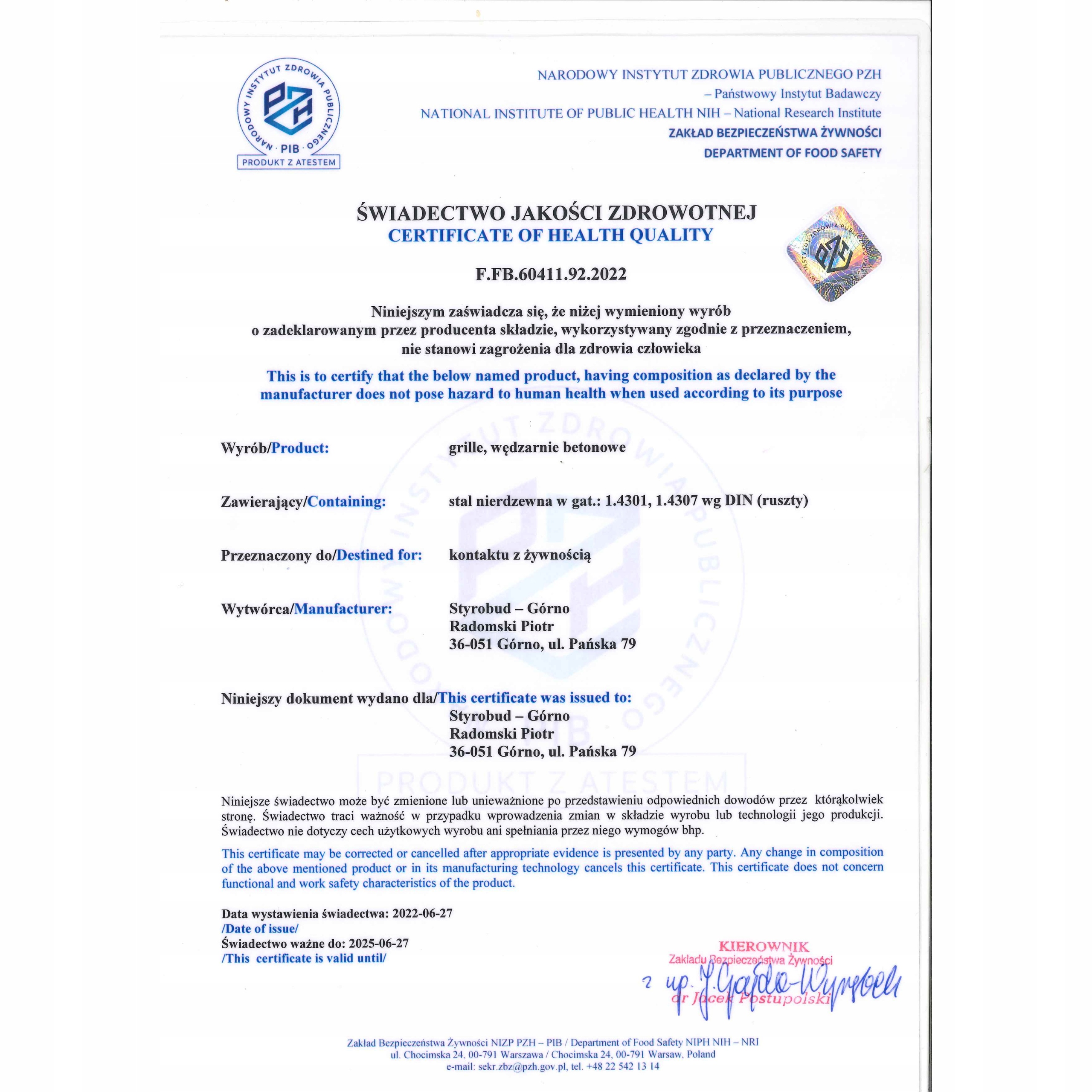 Наша продукція має сертифікат якості для здоров'я, що означає, що вона безпечна для здоров'я людини та екологічно чиста. Це надзвичайно важливо для продуктів, які контактують з їжею. Завдяки цьому ви можете бути впевнені, що страви, приготовані в нашій коптильні, будуть корисними і не містять шкідливих речовин.