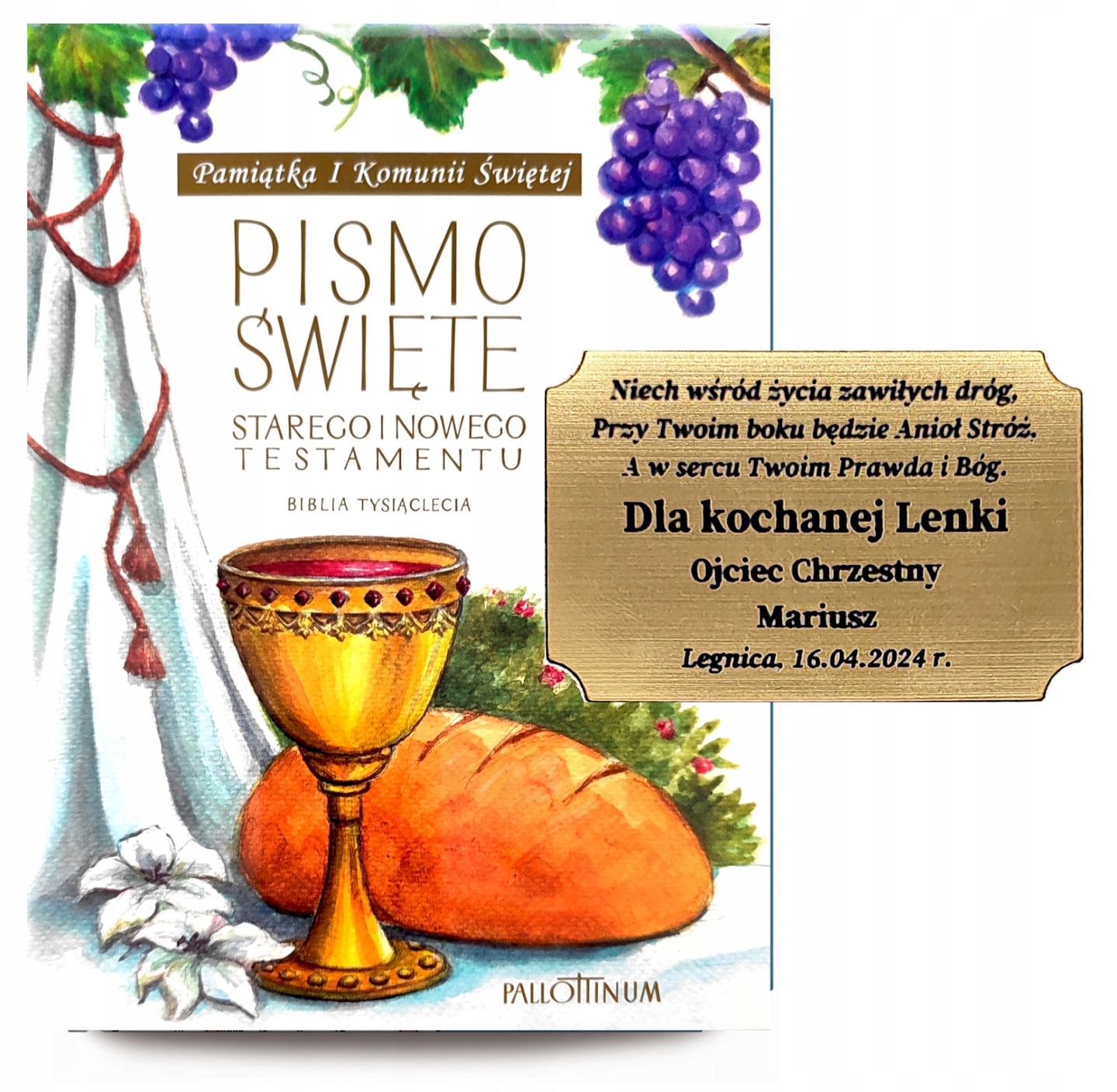 Повне видання Біблії тисячоліття – Святого Письма Старого та Нового Заповіту в твердій обкладинці, з суперобкладинкою та вкладишем для Першого Святого Причастя.