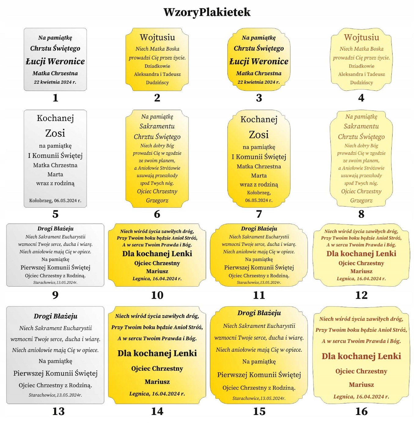 - присвята: напр., «На згадку про Хрещення Святої Луції Вероніки, хрещеної матері 22 квітня 2024 року»