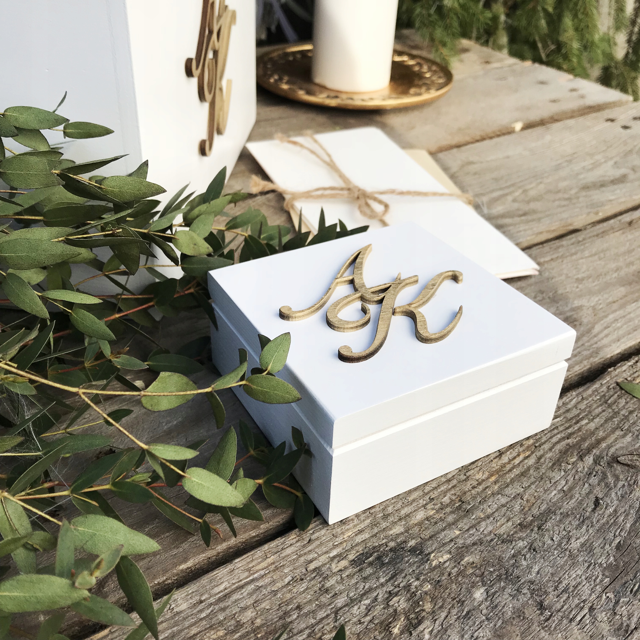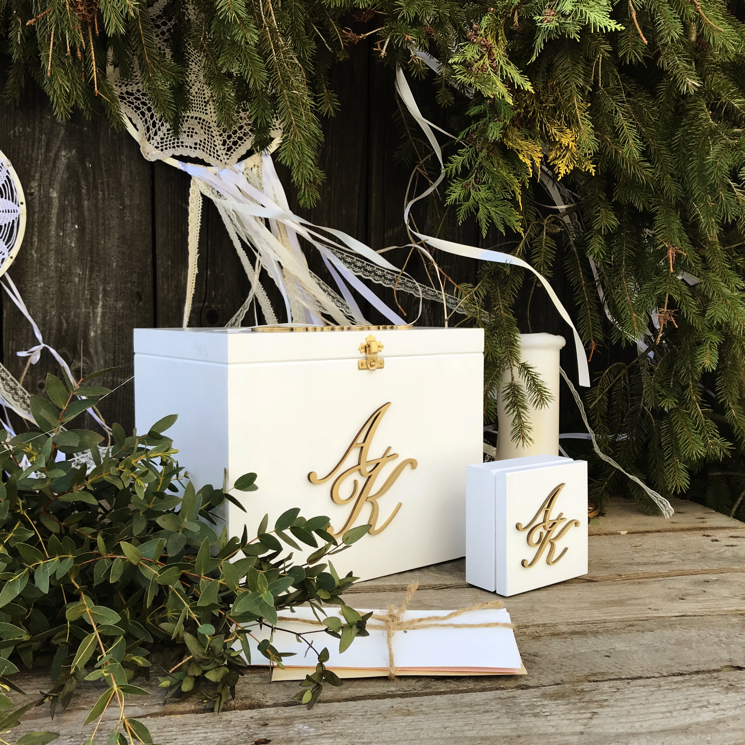 На нашому аукціоні ми пропонуємо гарний БІЛИЙ КОМПЛЕКТ: коробка для обручок і коробка для конвертів.