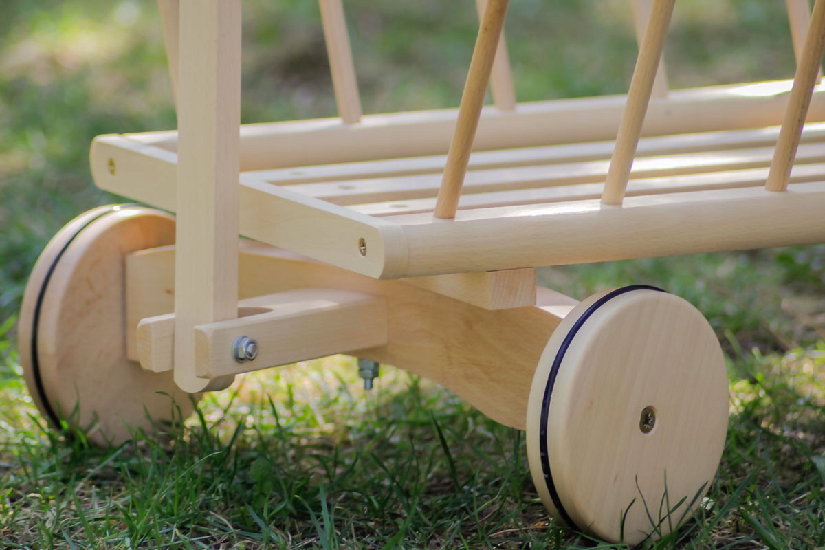 Великий дерев'яний візок з ажурною конструкцією бортів і дна. Колеса з антиковзаючим гумовим ущільнювальним кільцем. Вона стане прикрасою вдома та у дворі.