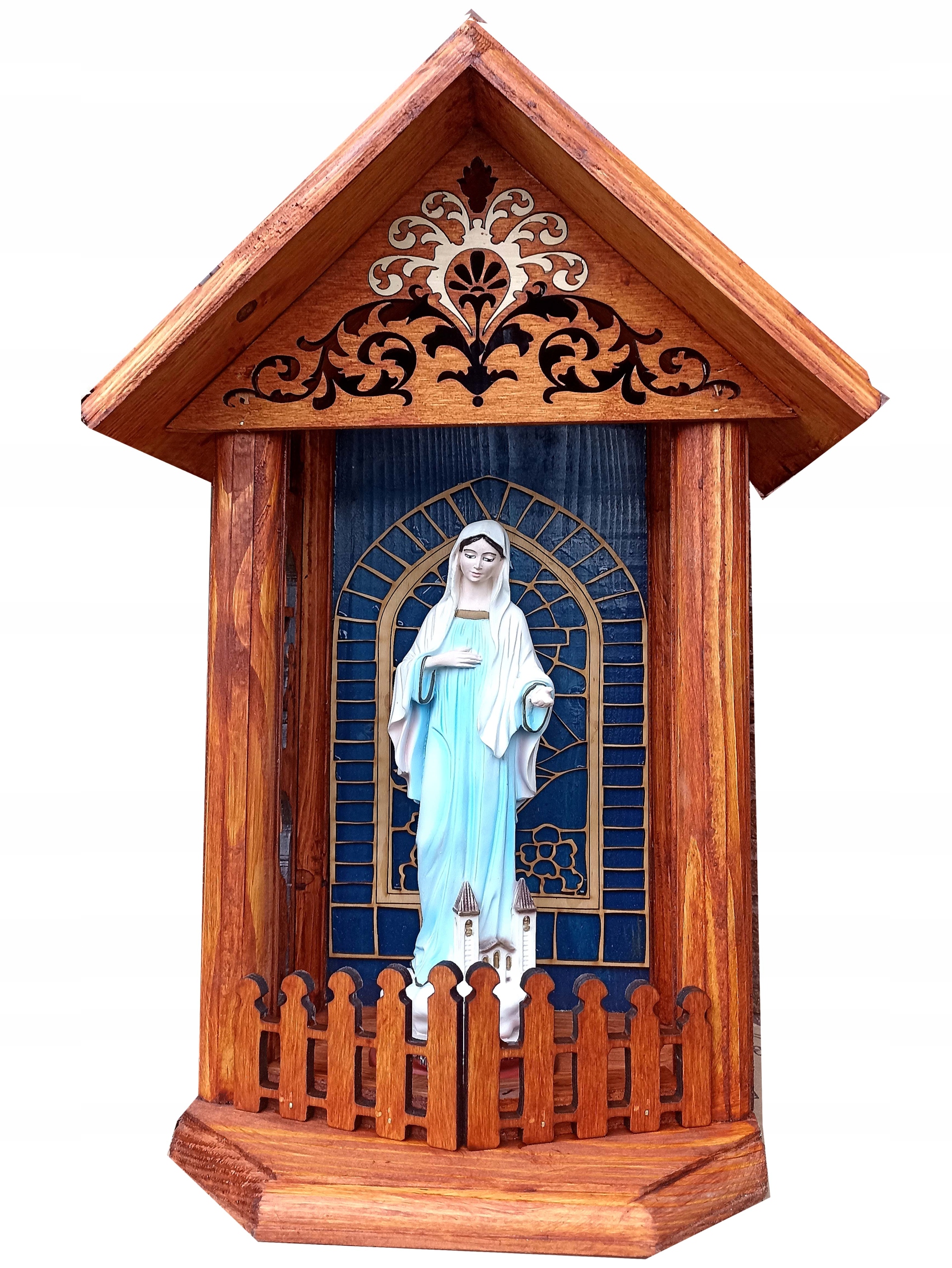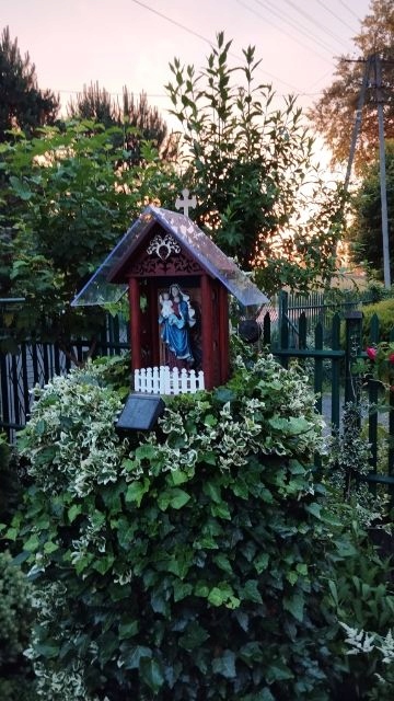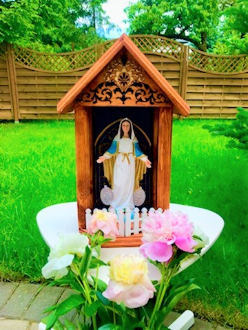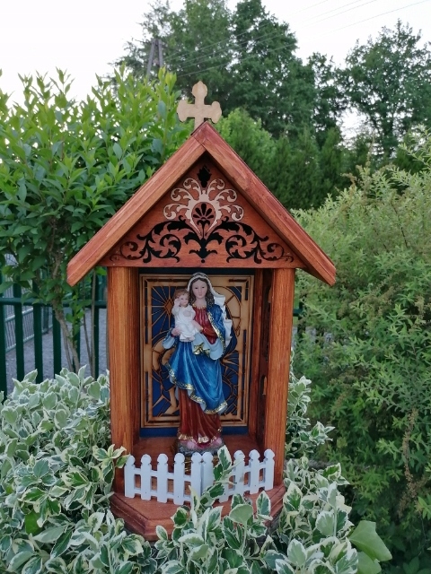 Ви можете придбати склянку для святині, склянку не дарую, тому що фігурки тепер виготовлені з матеріалів, які стійкі до погодних умов і їх не потрібно накривати постійно парним, часто брудним скло, за яким фігурку майже не видно. У цій святині кожна фігурка виглядатиме красиво і буде видно здалеку.