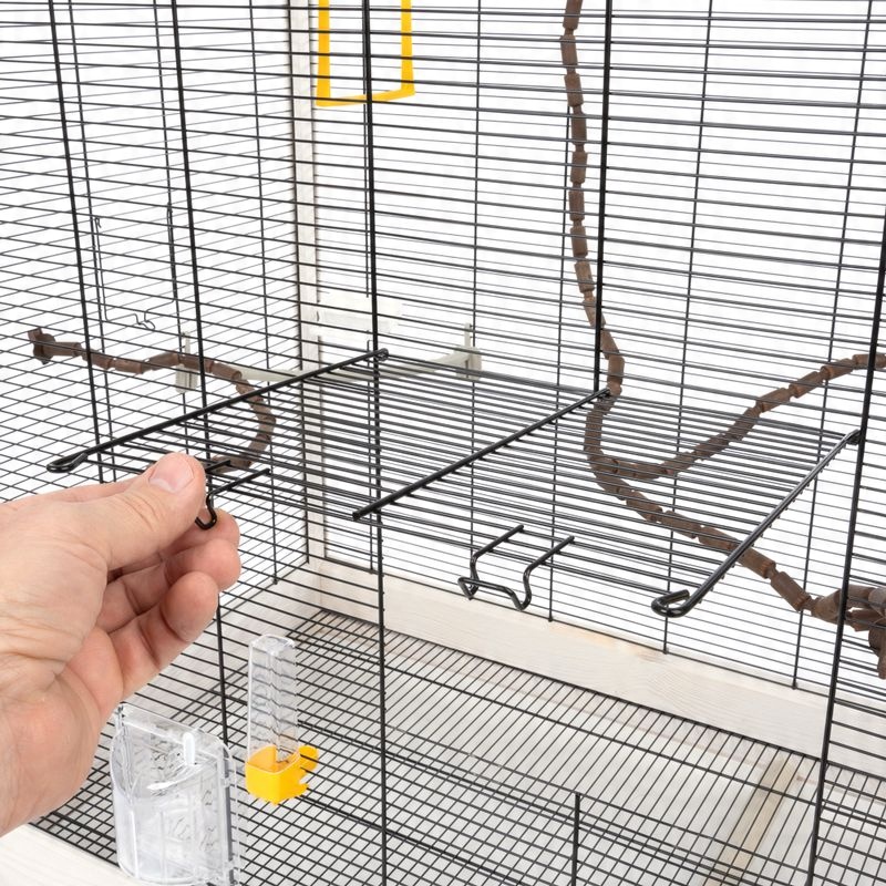 Повністю обладнана клітка для птахів Robin XXL від TIAKI підходить для канарок, екзотичних птахів та інших менших видів і пропонує все, що потрібно вашим крилатим друзям. Крім пляшок для напоїв і контейнерів для їжі, в комплектацію входять затискачі для овочів і підставки для печива. Ідеальні умови для повноцінного та різноманітного харчування. Щоб підтримати радість від руху, є гойдалка та гнучкі сидіння, подібні до гілок, які можна вільно формувати та прикріплювати до різних місць у клітці. Таким чином, ви можете час від часу вносити зміни, щоб запропонувати своєму маленькому другу різноманітний інтер’єр клітини.