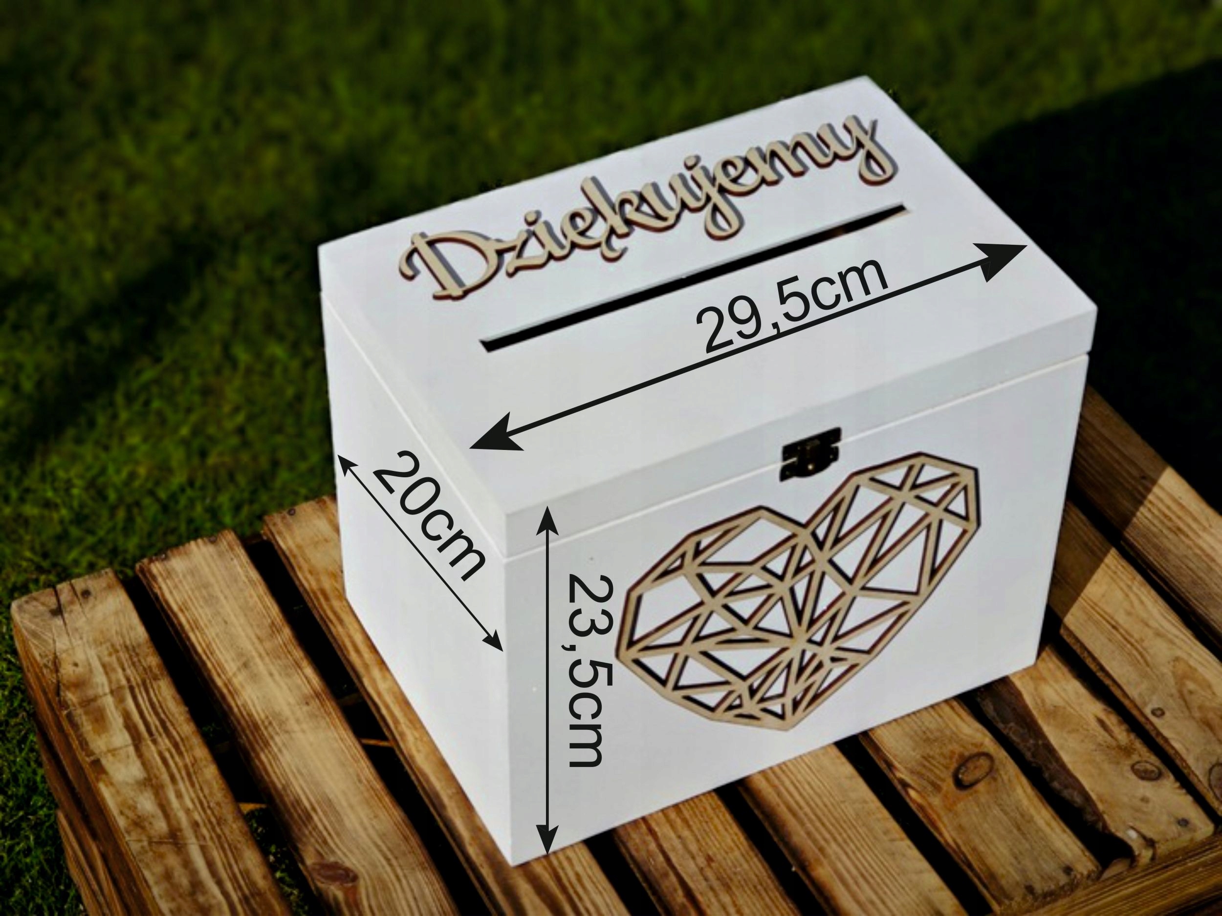 Велика дерев'яна коробка, коробка для весільних конвертів з написом дякую і сердечко, закривається на замок і коробка для обручок з написом чоловік і дружина. Найпоширенішими подарунками для нареченої і нареченої є конверти з грошима, вітальні листівки, скретч-карти або лотерейні квитки. Наша велика дерев'яна коробка для весільних конвертів ідеально підходить для цього особливого дня, у неї можна помістити все. Наша коробка поєднує в собі функціональність з елегантністю та виготовлена з увагою до кожної деталі. Коробка для конвертів має великий отвір у верхній частині. Ящик закривається на засувний замок, що забезпечує безпеку та є дуже функціональним. Ящик 100% екологічний, виготовлений з дерева. Напис подяка і сердечко вирізане з фанери, колір натуральний.