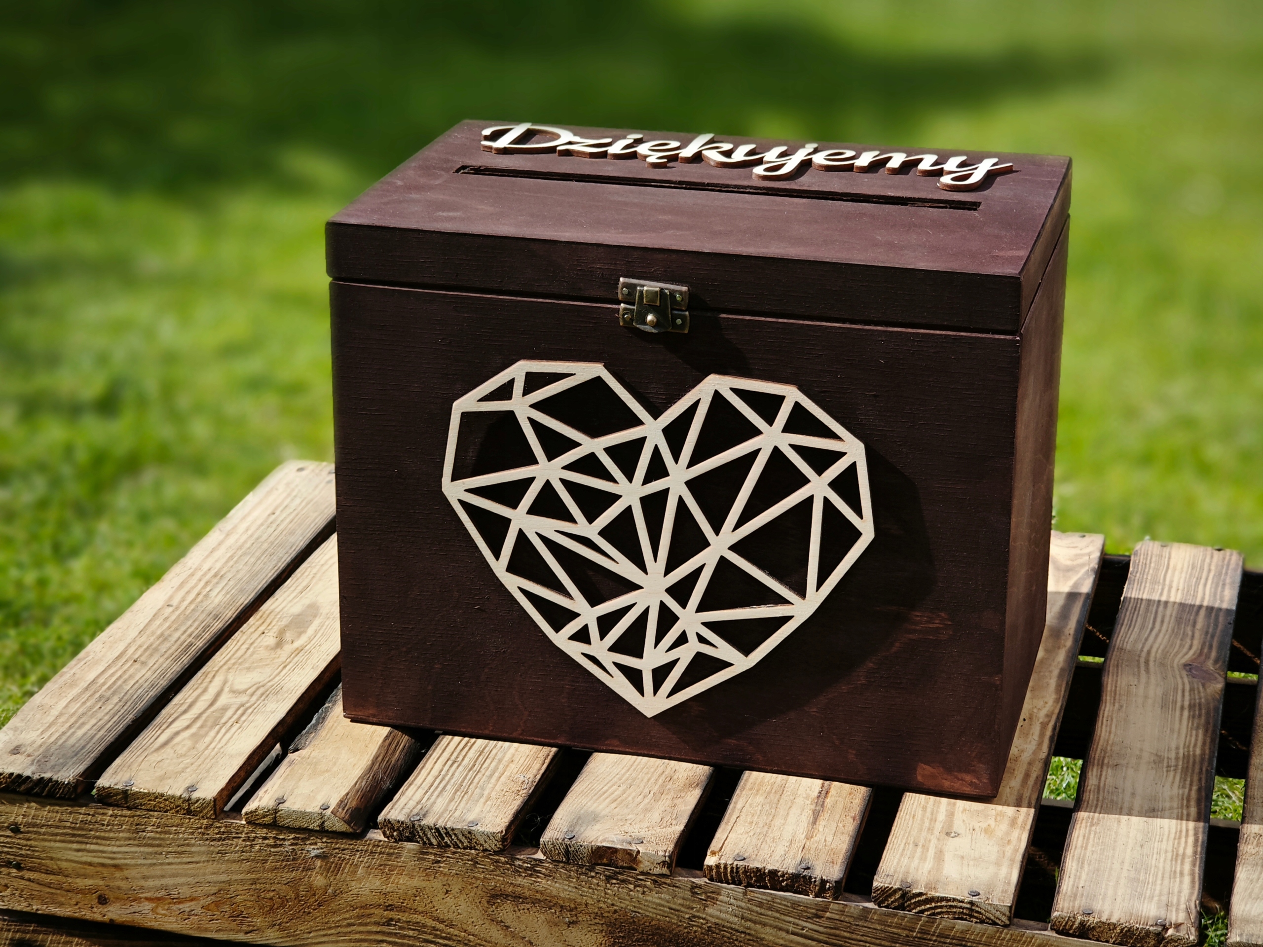 Велика дерев'яна коробка, коробка для весільних конвертів з написом подяка і сердечком, закривається на замок. Найпоширенішими подарунками для нареченої і нареченої є конверти з грошима, вітальні листівки, скретч-карти або лотерейні квитки. Наша велика дерев'яна коробка для весільних конвертів ідеально підходить для цього особливого дня, у неї можна помістити все. Наша коробка поєднує в собі функціональність з елегантністю та виготовлена з увагою до кожної деталі. Коробка для конвертів має великий отвір у верхній частині. Ящик закривається на засувний замок, що забезпечує безпеку та є дуже функціональним. Ящик 100% екологічний, виготовлений з дерева. Напис спасибі і сердечко, вирізане з фанери, колір натуральний.