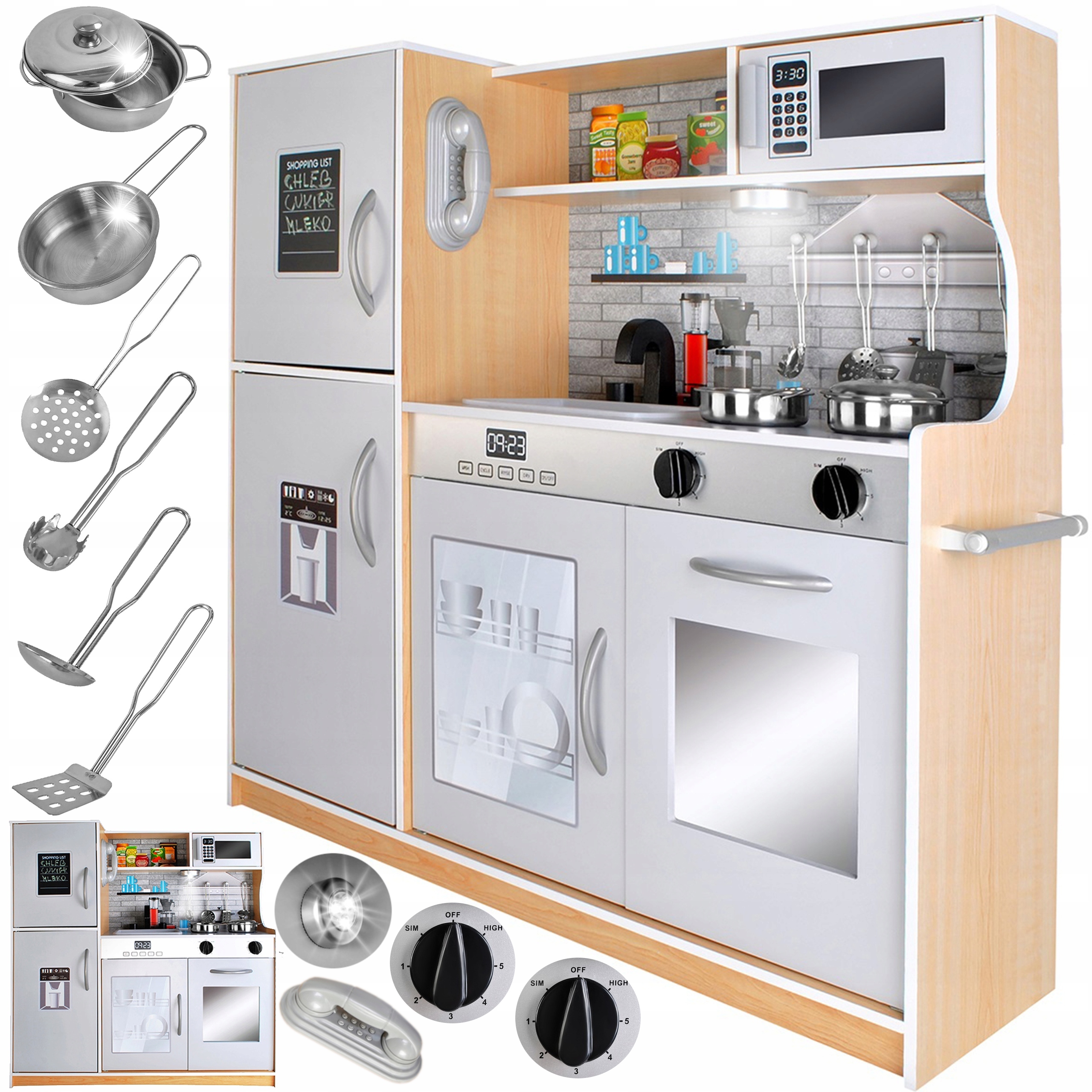 Діти люблять перетворюватися на дорослих - кулінарія - це мрія. Однак їм часто не вистачає відповідних місць та іграшок. З великою дерев’яною кухнею це вже не буде проблемою. Тепер маленький кухар зможе годинами готувати свої улюблені страви, тренуватися та розвивати свої творчі здібності. У набір входить світлодіодне освітлення, каструлі та аксесуари, які зроблять розвагу ще цікавішою та більше нагадуватиме повсякденне життя на справжній кухні.