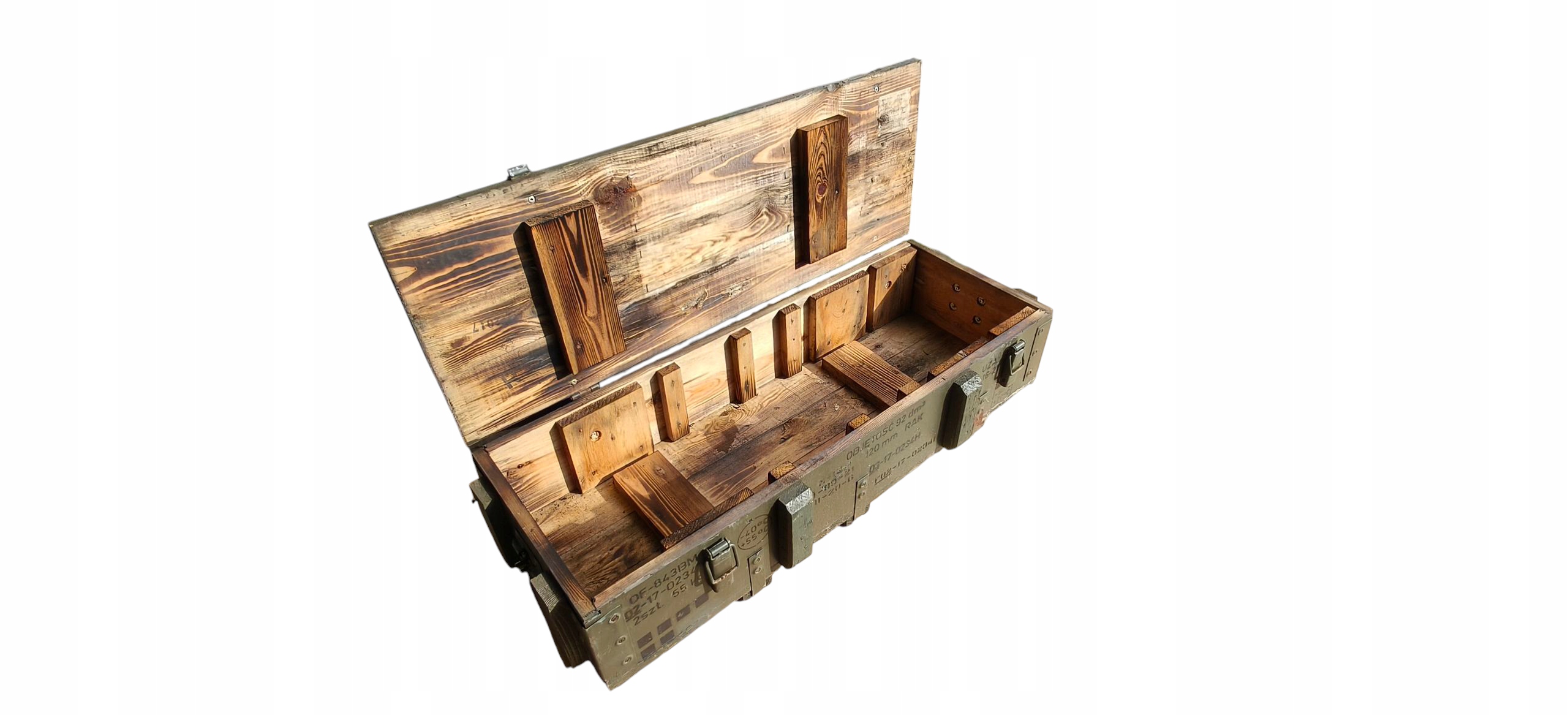 дерев'яна військова коробка передач у зеленому ступці. Коробка передач міцно виготовлена, закрита 2 затискачами, має металеву арматуру та суцільні петлі. Зовнішні розміри: