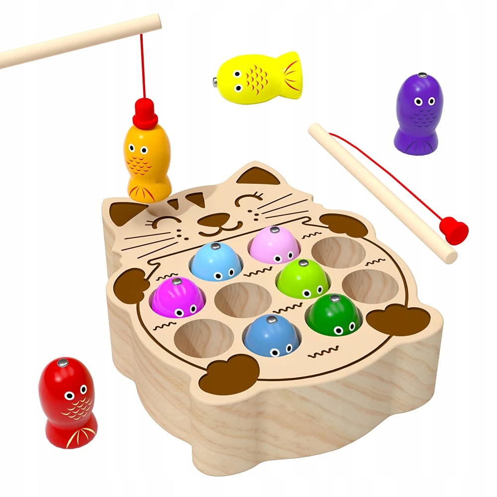 Набір містить різнокольорових рибок з магнітами, яких ми піднімаємо за допомогою вудки, а потім поміщаємо в отвори в основі кота. Дитина може вільно рухатися і сортувати рибок. Така розвага не набридне швидко! :)
