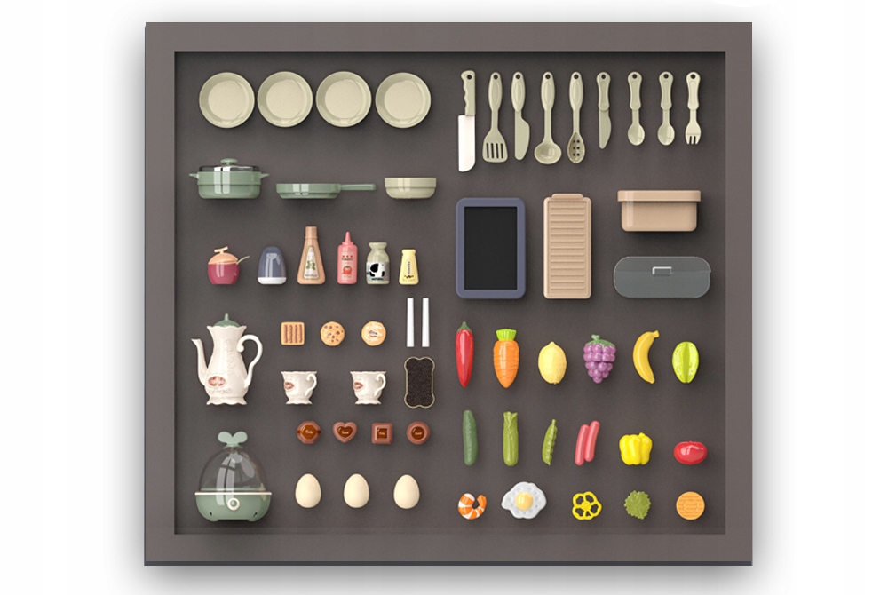 - включає 65 аксесуарів (фрукти, овочі, каструлі, тарілки, столові прилади, печиво, шоколад)
