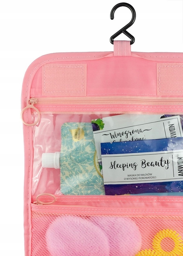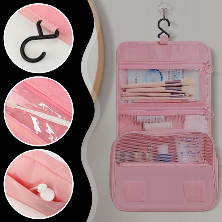 Дорожня косметичка, яку можна повісити як зручний органайзер - ідеальне рішення для мобільних жінок, які хочуть добре доглядати за собою навіть під час подорожей. Складена косметичка – це естетична валіза, а в розкладеному вигляді – практично шафка для ванної кімнати. Косметичка виготовлена з водонепроникного матеріалу. Ви можете вільно повісити її в зручному місці завдяки прикріпленій вішалці.