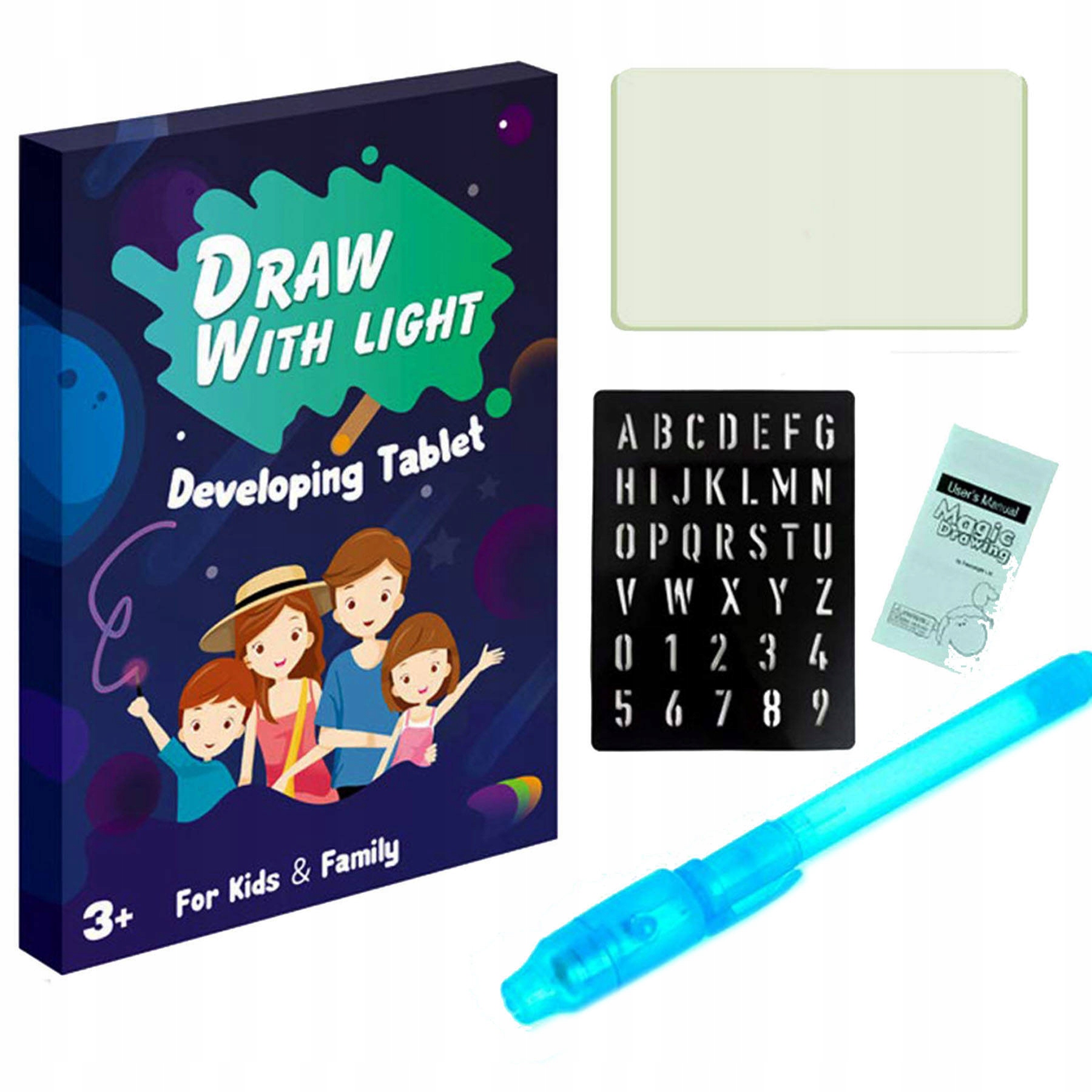 Набір оснащений світловою дошкою для письма, УФ-LED ручкою та трафаретом для малювання буквами. Перевага цієї іграшки в тому, що дитина не бруднить руки під час гри.