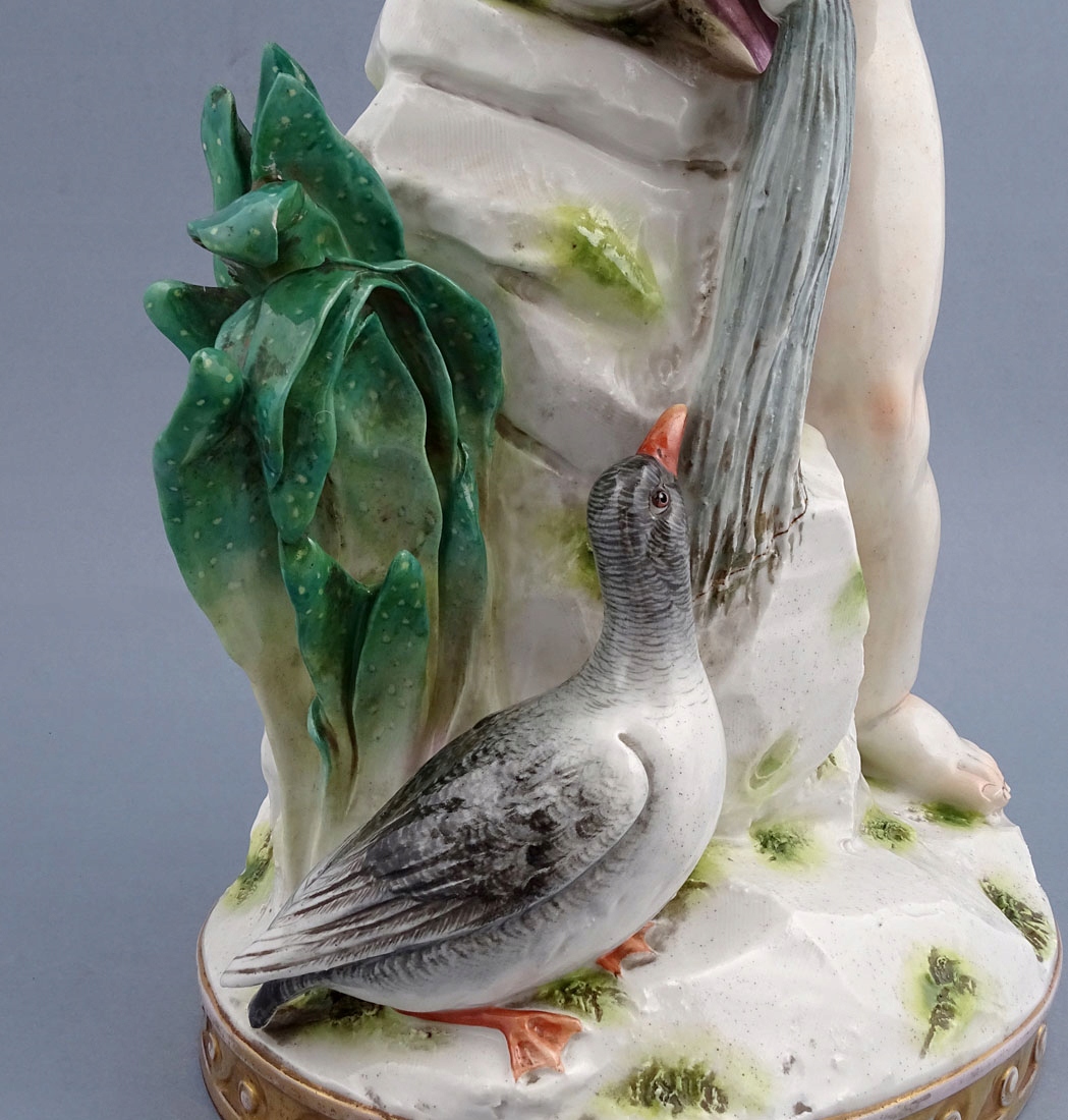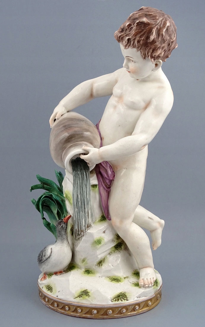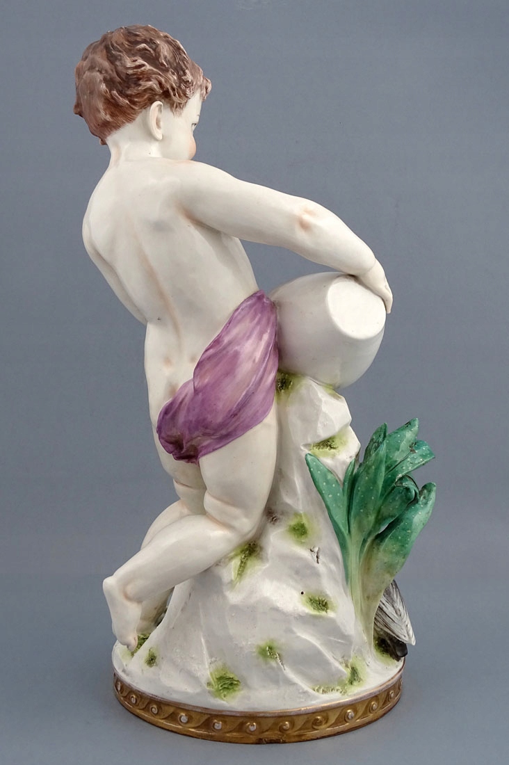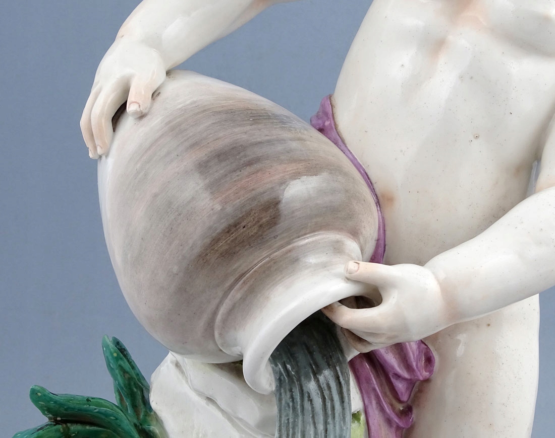 розташована на круглій підставці, прикрашеній позолоченими візерунками, зі скелястою платформою, на якій встановлено глечик з який тече вода підтримується. Сам хлопець лише підперезаний розпущеним рожевим поясом, з пишним волоссям і посмішкою на обличчі, а біля нього в основі — дика качка та зелена рослина, схожа на алое.