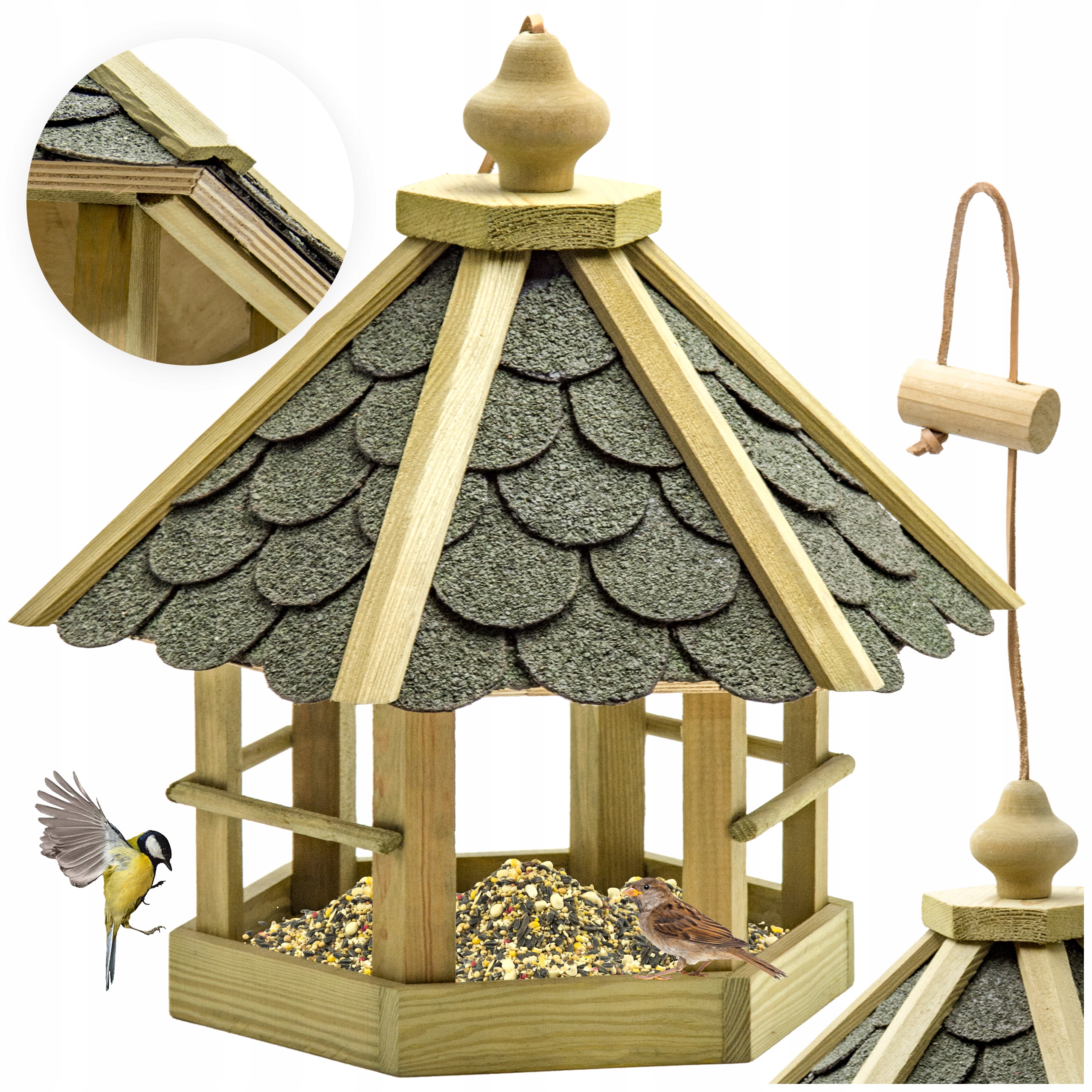 Годівниця оснащена суцільним дахом, покритим гудроном, який не тільки додає їй елегантності, але й ефективно захищає нагодованих птахів від дощу та зберігає їжу в ідеальному стані. стан.