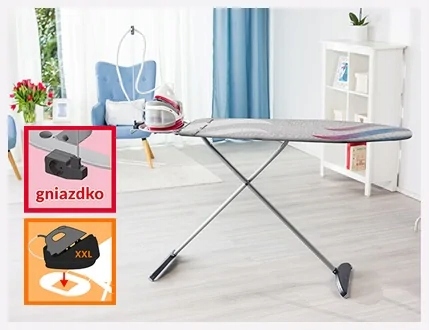 Елементом дошки також є вбудована електрична розетка, яка розташована збоку від підставки. Це рішення обмежує заплутування шнура праски та дозволяє вільно переміщати обладнання.
